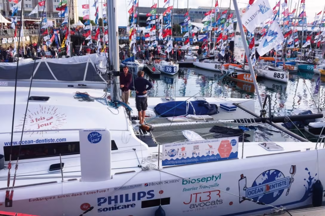 Depuis plusieurs années, nous initions divers projets associatifs autour de la voile. L’objectif à chaque fois est de structurer notre passion pour la voile autour d’une action sociale utile. Cela nous a amenés à régater sous les couleurs de la mutuelle MGC pour les maladies de peau liées au soleil, à créer une régate FFV pour une association de l’Himalaya, et finalement, en 2013, nous avons lancé un concept de prévention bucco-dentaire à la voile. Dans un premier temps sur un Pogo 8.50, avec lequel nous avons effectué une première traversée de l’Atlantique, les cales chargées de matériel de prévention pour les marins et les enfants. Au retour, nous avons planché sur une évolution du concept en installant un vrai cabinet dentaire dans un bateau. Le TS 42 Océan Dentiste est mis à l’eau en juillet 2016. Le fauteuil dentaire est intégré à la structure de la nacelle sur un système de rail, ce qui permet de moduler l’espace en deux modes : navigation ou cabinet dentaire. L’objectif étant d’apprendre aux enfants à bien se brosser les dents, tout en rassurant les plus effrayés d’entre eux. Pour cela, nous utilisons des outils de dernière génération : brosses à dents connectées à l’application gratuite Philips Sonicare, caméra Acteon de détection des caries et du mauvais brossage, et bien sûr, distribution de brosses à dents écologiques ! En un an, plus de 3000 enfants ont été sensibilisés dans les écoles et à bord du bateau, sur 15 villes étapes entre St-Malo et La Rochelle. Après les écoles de Martinique, de Guadeloupe et de St-Martin, avec notre petit Max, nous mettrons le cap sur St-Pierre-et-Miquelon, dès que la neige aura disparu !