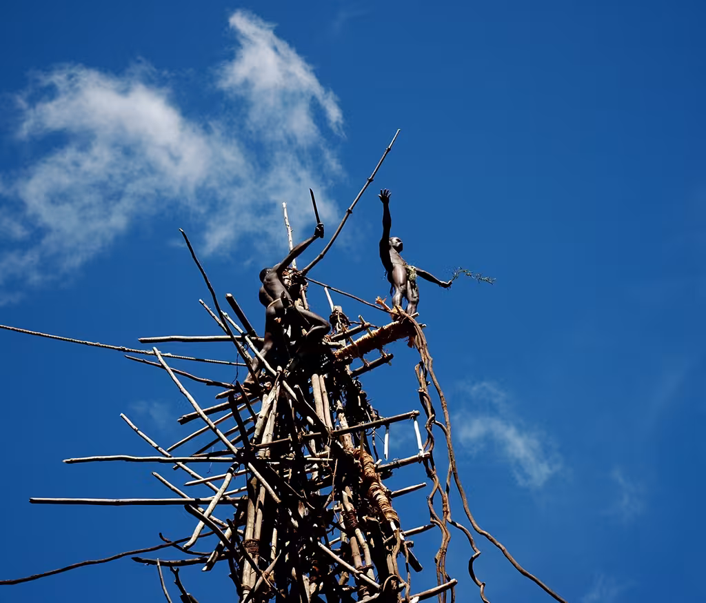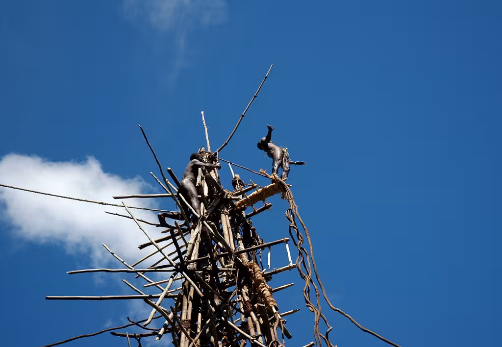 Mais, si le N’gol est bien l’ancêtre du saut à l’élastique, tenté pour la première fois en 1979 par les Anglais du Dangerous Sports Club de Bristol sur le pont de Clifton Bridge, et mis au point ensuite en Nouvelle-Zélande, un élément fondamental différencie les deux types de saut, outre de nombreux aspects liés à la sécurité : les lianes naturelles attachées aux chevilles des sauteurs de Pentecôte n’ont elles-mêmes qu’une très faible élasticité !!! La chute du sauteur est (brutalement) freinée au ras du sol par la rupture de la plate-forme de saut lors de la tension brutale des lianes, ainsi que par la flexion de la tour. Dans la coutume, le saut n’a lieu que si la récolte d’ignames est bonne, car, dans la culture des villageois, il existe un lien entre la qualité des ignames et la souplesse et la solidité des lianes utilisées pour le saut. Mais, contradictoirement, les villageois pensent aussi que, même si les conditions de pluie et d’ensoleillement n’ont pas été idéales lors des derniers mois, le saut favorisera la récolte d’ignames… Le saut procure aussi aux jeunes gens du village l’occasion de parader devant les jeunes femmes, de montrer leur courage, et le cas échéant de rendre publics leurs éventuels différends avec certains membres de la communauté villageoise. Le rite du saut est ainsi très présent à l’esprit de tous les villageois, tout au long de l’année, et il n’est pas rare de voir les enfants construire de petites plates-formes de saut près de la plage, en contrebas du village, où ils s’amusent à prendre les postures des vrais sauteurs du village. L’emplacement de la tour doit répondre à 2 critères principaux : présenter une pente suffisamment raide au niveau de la zone d’atterrissage des sauteurs, mais en même temps offrir une zone suffisamment plate à proximité immédiate de la tour pour permettre les danses et les chants qui accompagnent le saut. La tour elle-même, construite entièrement avec des rondins de bois ligaturés avec des fibres végétales, est érigée autour d’un arbre-support (koro) dont les branches ont été coupées. Un cocotier, ou un banian. La tour, qui mesure environ 50 pieds (15 mètres) à Rangusuksu, est haubanée par des lianes aux arbres environnants. Elle ne sert qu’une seule saison. Des écorces de bananiers entourent les pieds de la tour, pour amortir le choc de rappel d’un sauteur qui aurait raté son saut et qui viendrait les percuter. L’ensemble de la tour est construit au moyen de machettes et de couteaux dont les Ni-Vans font un usage permanent. La zone d’atterrissage des sauteurs se situe dans la pente en abord de la tour, une pente dont l’inclinaison est choisie et si besoin retravaillée. Sa surface de terre est rendue meuble sur une profondeur de 30 cm environ pour amortir les chocs, et cette opération se répète après chaque saut. A proximité de la tour, mais à l’opposé de la zone d’atterrissage des sauteurs, est aménagée une aire de danse, plutôt horizontale, elle. C’est là que se tiennent les hommes du village, les anciens, dont le chef, au premier rang, les hommes plus jeunes ensuite. Tous essentiellement habillés d’un… étui pénien. Les anciens portent des armes symboliques et cérémonielles en bois. Les jeunes garçons du village sont présents, dans la même tenue. Le rite du saut est accompagné de chants et de danses. A Saint-Joseph, c’est le chef du village qui menait les chants, dont l’intensité vocale varie en fonction de l’état de préparation du sauteur sur la tour, pour connaître un paroxysme dans les instants qui précèdent le saut. Les chants sont émaillés de cris qui répondent à ceux émis en haut de la tour par le sauteur. La tour est équipée de plusieurs petites plates-formes de saut en bois, confectionnées à terre et fixées ensuite à la tour, à différents niveaux. La première, utilisée par les jeunes garçons, se situe à environ 5 mètres de hauteur. Les suivantes sont positionnées tous les 3 mètres à peu près. La plate-forme la plus élevée, réservée à l’élite des sauteurs, est fixée tout en haut de la tour. A environ 15 mètres au-dessus du sol. Avec le dénivelé de la zone d’atterrissage, 2 à 3 mètres, c’est donc un saut d’au moins 18 à 19 mètres (soit 6 étages) que la tête du sauteur effectuera, puisqu’il plonge vers le sol tête en avant ! Les lianes réservées aux sauts sont choisies dans la forêt, coupées puis roulées pour être emmenées, préparées puis fixées à la tour. Leur diamètre est proportionnel au poids du sauteur et à la hauteur du saut. La longueur utile des lianes est soigneusement calculée pour que la tête du sauteur effleure le sol en fin de saut !!! Il faut reconnaître que c’est un rite hallucinant ! Les extrémités des lianes qui seront attachées aux chevilles des sauteurs sont partagées au couteau en fins rubans végétaux qui doivent rester souples et humides. Ils sont enrobés pour ce faire dans des feuilles de sega, enlevées juste avant le saut. Ce sont 3 jeunes garçons, d’environ 6 à 7 ans, qui commencent à sauter en premier. Inutile de vous dire qu’avec notre conception des choses à nous, Occidentaux, le simple fait de voir ces jeunes enfants à qui deux hommes attachaient les lianes aux pieds et qui s’apprêtaient à sauter dans le vide vers le sol la tête la première me donna d’abord l’envie de repartir immédiatement en courant… Sur les 3 jeunes sauteurs, 2 renoncèrent finalement devant l’épreuve, malgré les chants et les cris d’encouragement des aînés. Ils ne furent pas vilipendés par les anciens, mais je constatai, au coup de machette un peu rageur qui trancha les lianes nouées à leurs pieds, que ce renoncement avait quelque peu énervé les deux hommes qui venaient de passer quelque dix minutes à chaque fois à attacher avec soin les lianes autour de leurs che