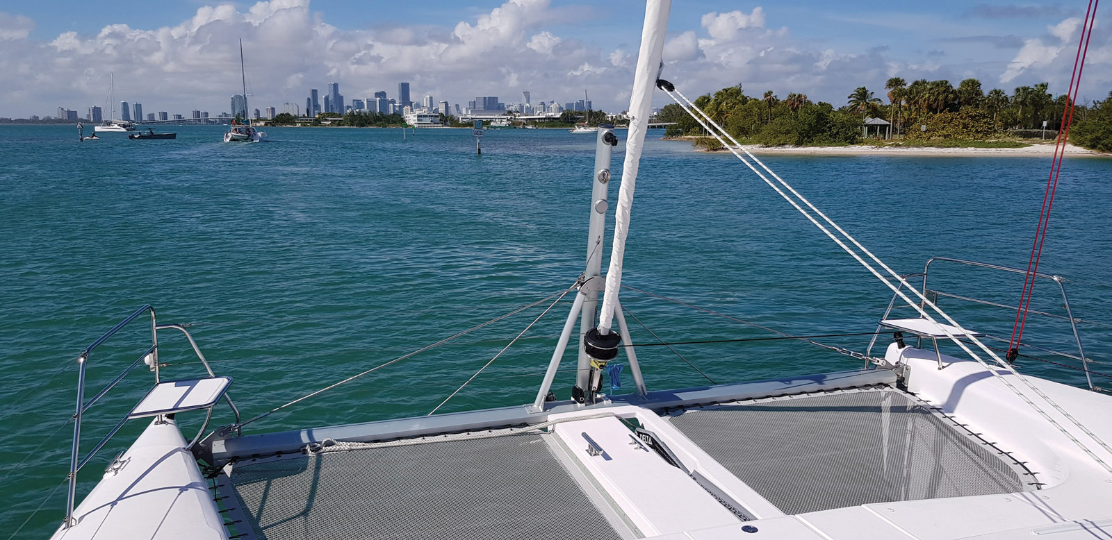 Il est préférable de naviguer dans les Keys et les toutes proches Bahamas à bord d’un bateau à faible tirant d’eau, ou à quille relevable ; l’idéal est bien sûr un multicoque, comme je l’ai fait récemment sur le tout nouveau catamaran Seawind 1260 de Sailaway Charters. L’itinéraire représente l’extrémité sud de l’Intracoastal Waterway (ICW) de 3 000 milles qui conduit en toute sécurité les plaisanciers jusqu’au sud de Boston, dans le nord-est des Etats-Unis. Les Bahamas et ses eaux peu profondes mais magnifiques, parsemées de coraux, représentent un joli plan d’eau fréquenté par les plaisanciers qui quittent Miami, à seulement 115 milles au sud-est. Miami est une ville fascinante, à l’extrémité sud de la Floride, elle est la porte d’entrée des Keys, souvent qualifiée de « capitale de l’Amérique latine » en raison de sa population issue majoritairement de Cuba et des Antilles. On y trouve probablement le meilleur rhum du monde, ma préférence allant vers certaines variétés guatémaltèques ou encore vénézuéliennes, piquantes et légèrement sucrées, servies par de sympathiques expatriés cubains. L’intégralité de la région fut jusqu’aux années 1820 une colonie espagnole. Miami, l’une des villes les plus récentes d’Amérique, semble comme épinglée sur la côte à proximité immédiate des marais des Everglades à l’ouest, et du golfe du Mexique au sud. En tant qu’escale majeure pour les paquebots, son immense port vibre au gré des escales des gros navires, ou encore du quai des containers, très actif. Les marinas pour la plaisance y sont également pléthoriques, y compris celle située sur l’île de Key Biscayne, où j’ai embarqué sur notre catamaran de charter. La marina de Crandon Park a facturé 79 US $ une nuitée visiteur au ponton pour le 35 pieds de l’un de mes amis, mais il existe une option plus économique qui consiste à mouiller dans sa baie abritée, puis à prendre un Uber au bord de la route jusqu’au centre-ville de Miami pour y faire ses achats.