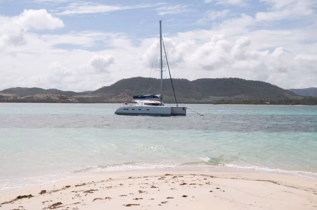 Après un vol sans histoire nous voici donc arrivant à l'aéroport Aimé Césaire du Lamentin. Notre navette nous attend à la sortie de l'avion, et moins de deux heures après avoir posé le pied en Martinique, nous voilà en train de siroter le premier petit punch sur la marina du Marin, à quelques encablures de notre Nautitech 44 qui attend fièrement son équipage pour déhaler… A peine les affaires dans le cockpit, nous partons donc de la marina pour aller mouiller à Sainte-Anne. Le mouillage devant l'anse Caritan est beaucoup plus agréable qu'une nuit à la marina. D'autant plus que le décalage horaire nous promet un réveil aux aurores. En fait d'aurore, nous serons tous réveillés à 3 heures du matin. On prend le petit déjeuner en regardant le soleil se lever, et la première baignade à l'aube nous revigore complètement… Il est temps de retourner à la marina, pour compléter l'avitaillement et récupérer notre skipper…