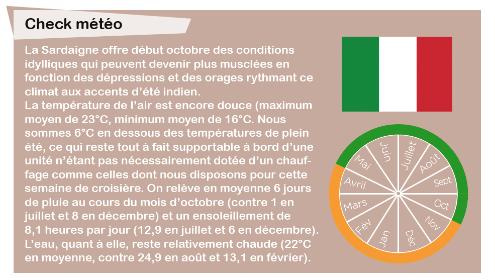 Olbia est une ville portuaire située au nord-est de la Sardaigne. Tout au fond d’un golfe relativement étroit, les navires de commerce et de transport de passagers relâchent régulièrement. Sur le papier, ce n’est pas un décor de rêve, mais une situation enviable par rapport à l’aéroport international d’Olbia, très bien desservi depuis l’Europe. Par sa localisation, Olbia permet également de prendre facilement en main le bateau, puis de découvrir rapidement des paysages plus ou moins arides mêlant falaises, plages, et bien entendu l’eau turquoise tant attendue…