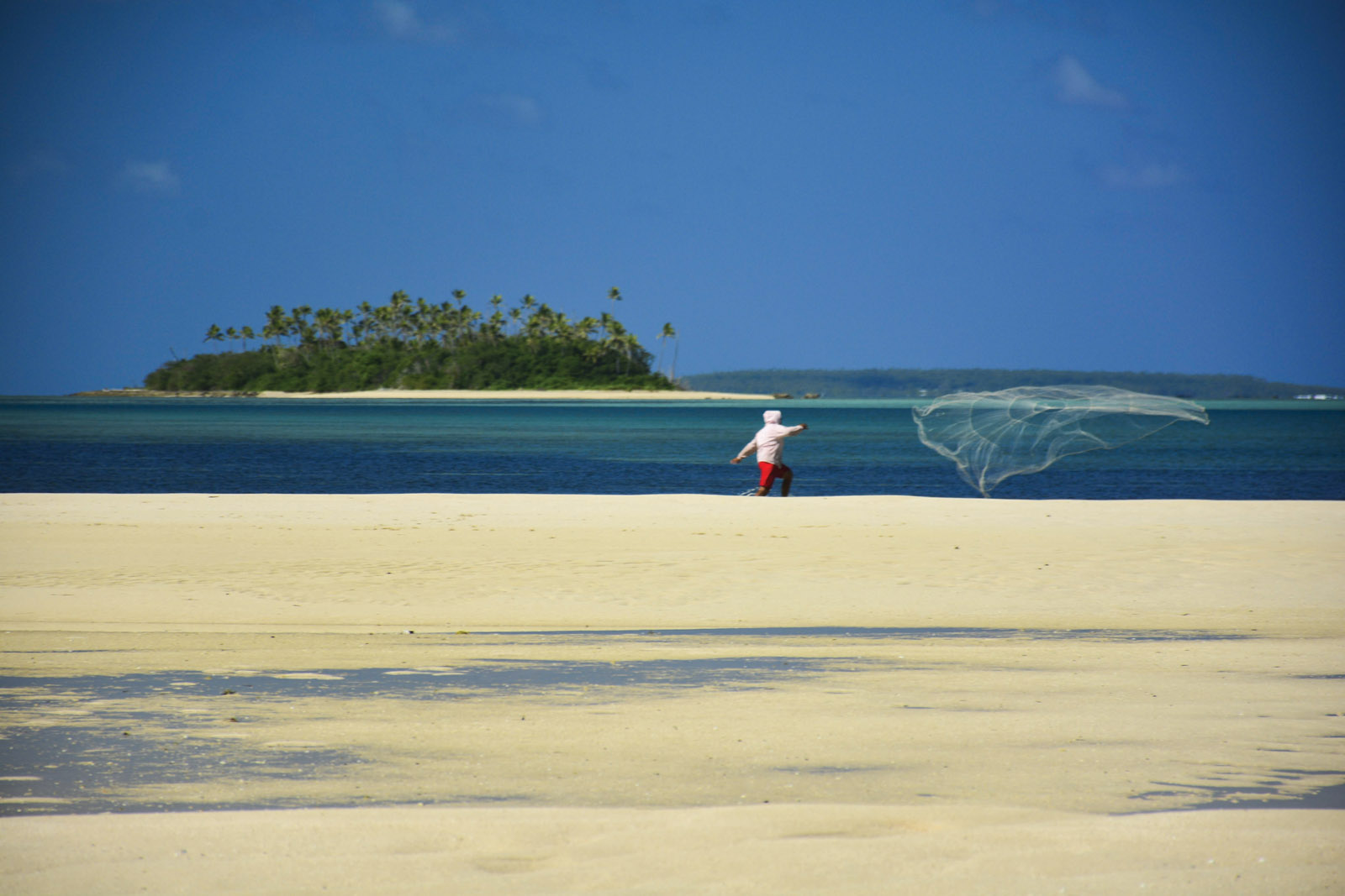 Un pêcheur tongien envoie son filet dans les bas-fonds sableux.
