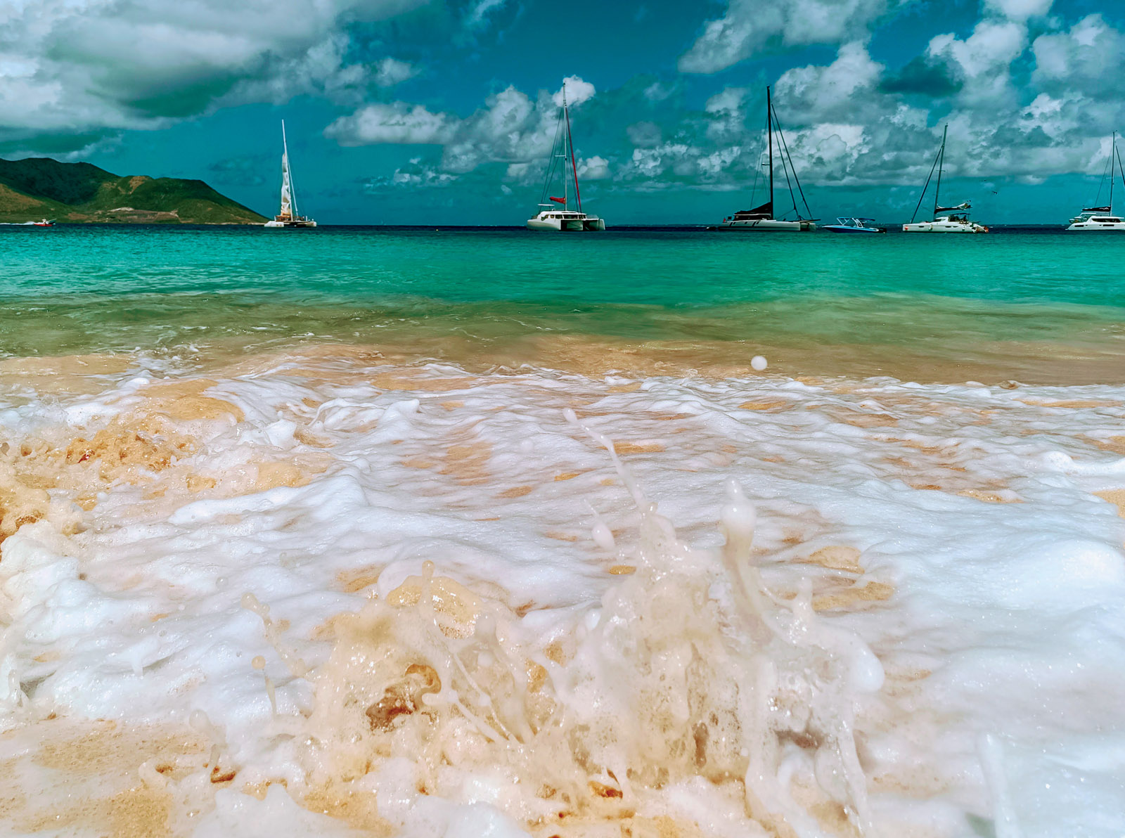 Par la volonté du vent et du courant, Yumelo a trouvé sa place dans le pêle-mêle ordonné du mouillage. Droit devant, à portée de brasse, le rivage rutilant nous tend les bras : nous organisons donc notre débarquement. Nous avons aimé atterrir, ressentir le sol rebelle qui se débat sous nos pieds devenus marins, la légère ivresse provoquée par le tangage de cette terre moins ferme qu’il n’y paraît. Conquérants explorateurs de paillottes et de pacotille, nous avons rapidement mis notre grapin (et notre gosier) sur le bar de la plage, et nous avons aimé nous asseoir face à la mer, contempler un autre point de vue en profitant de la saveur de la première gorgée de bière ou de la boisson locale à base de rhum.