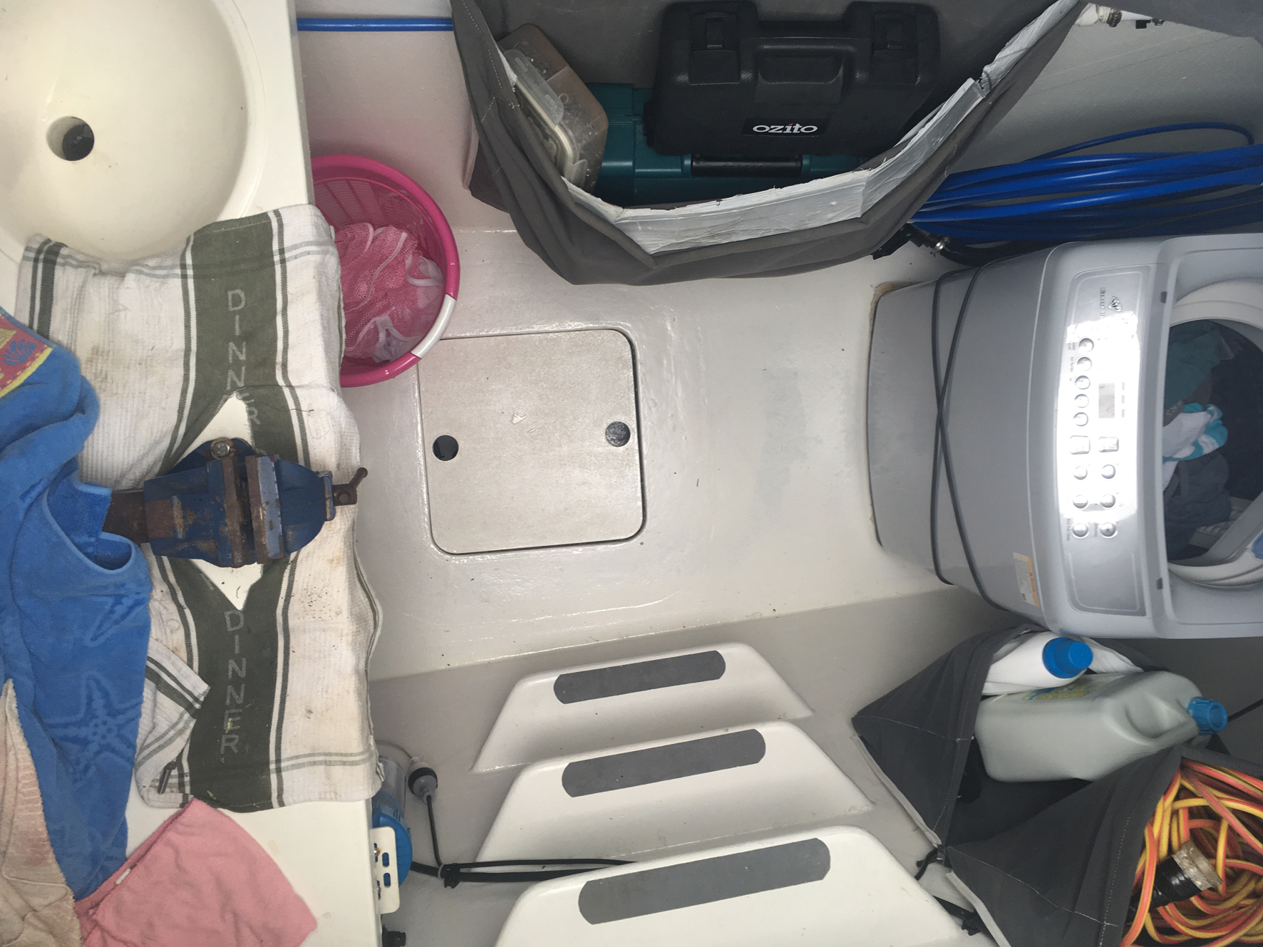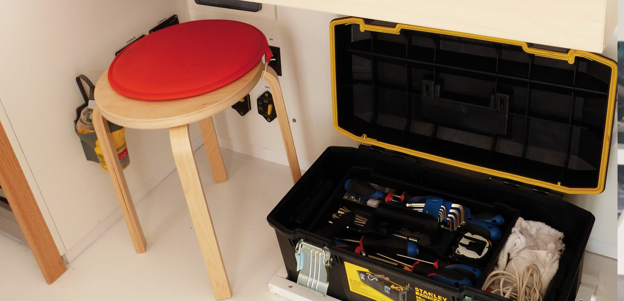 Lors d’un long voyage, on peut être amené à faire de gros travaux, et un espace dédié est un vrai plus. Sur un cata, il y a généralement assez de place pour utiliser une partie de la soute avant comme atelier. On pourra y installer un vrai établi muni d’un étau, ainsi que des étagères pour ranger le matériel de rechange, et des poches pour stoker l’intégralité de l’outillage.