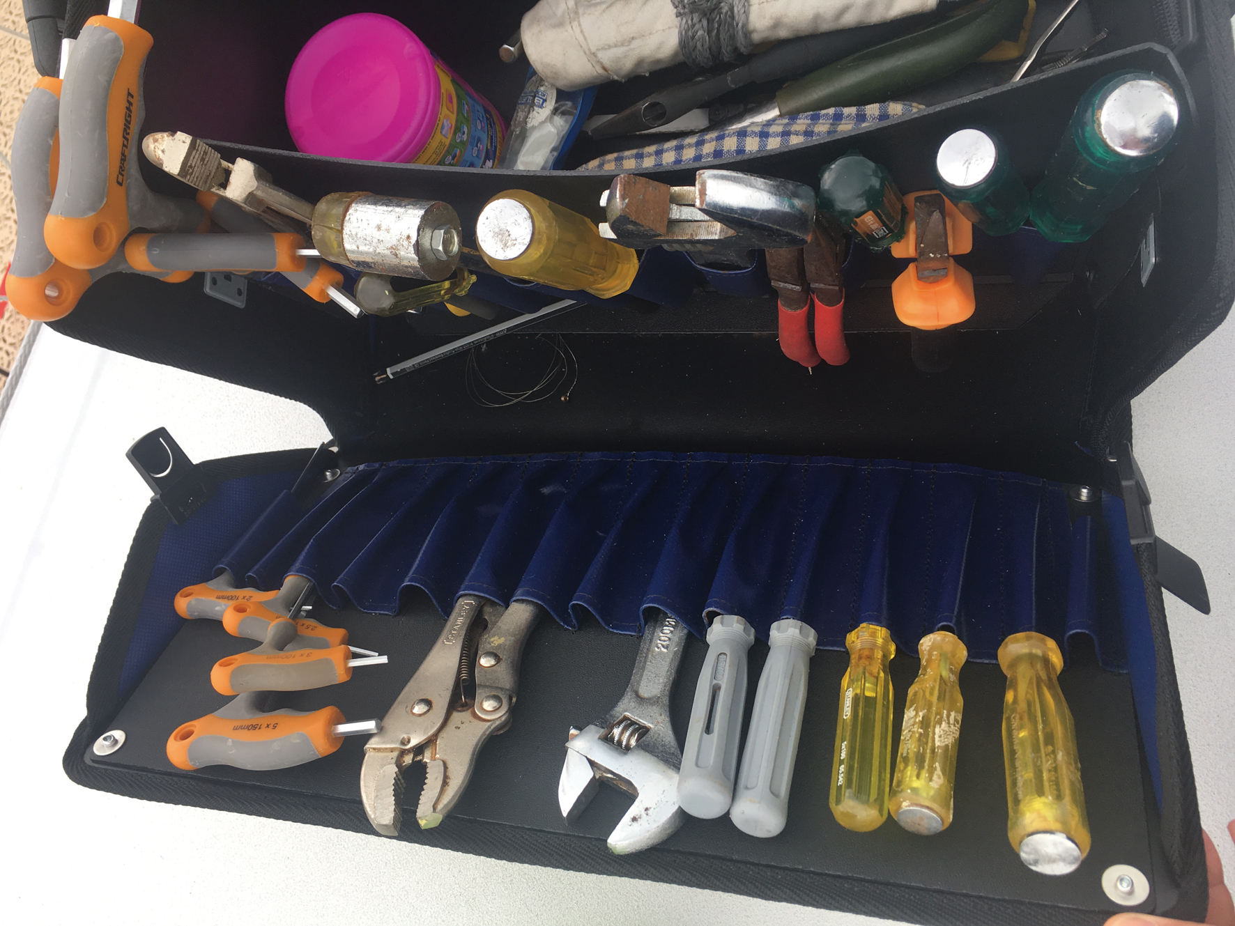 Le plus pratique pour utiliser les outils sur le pont est de les ranger dans une sacoche souple en toile, PVC ou plastique (surtout pas en métal, sous peine de ne plus pouvoir l’ouvrir après trois semaines de mer). Equipéé des patins antidérapants, vous pourrez la poser sur le pont sans qu’elle ne glisse. Les modèles avec de nombreuses poches individuelles sont pratiques pour disposer rapidement de l’outil souhaité.