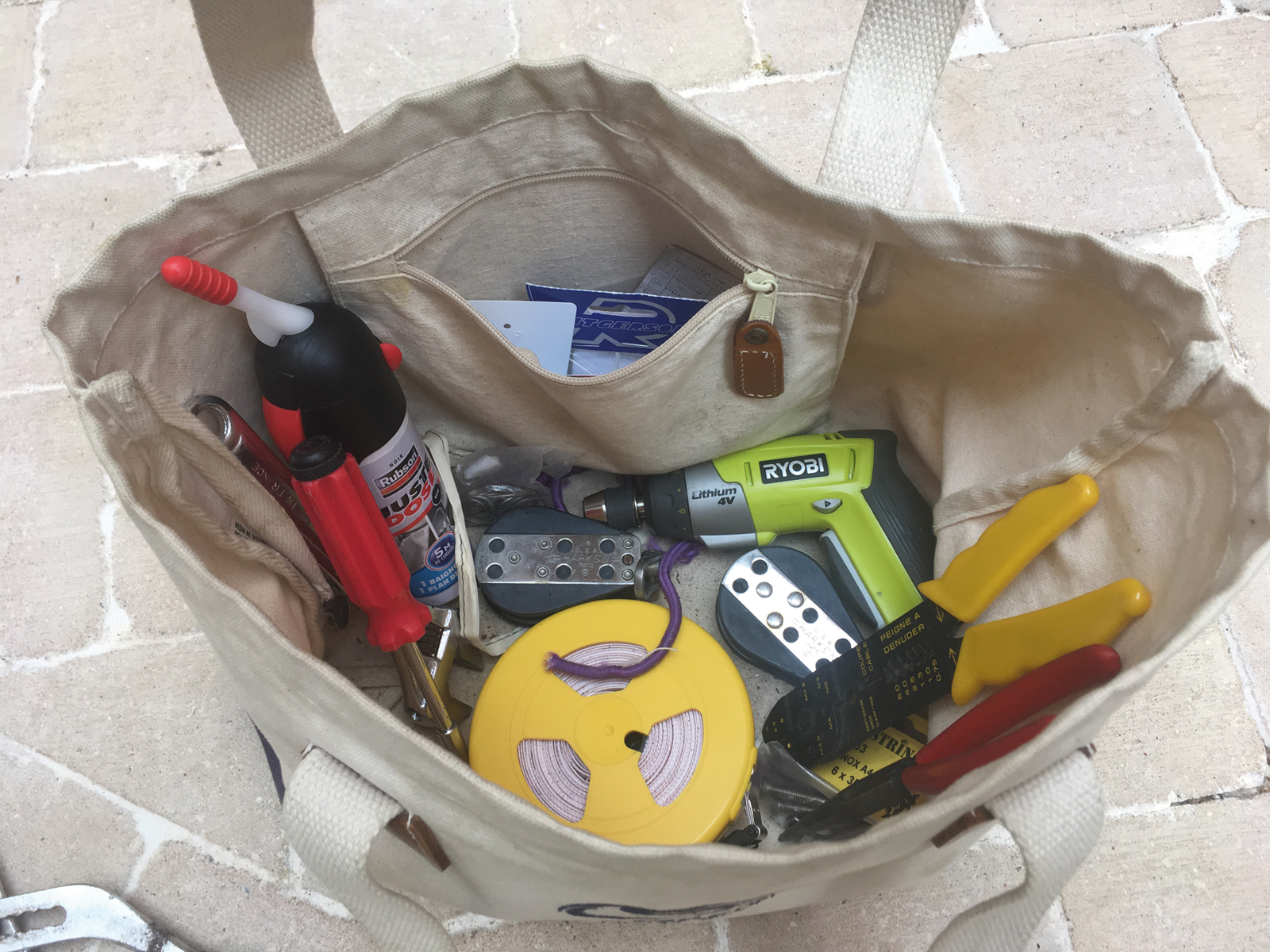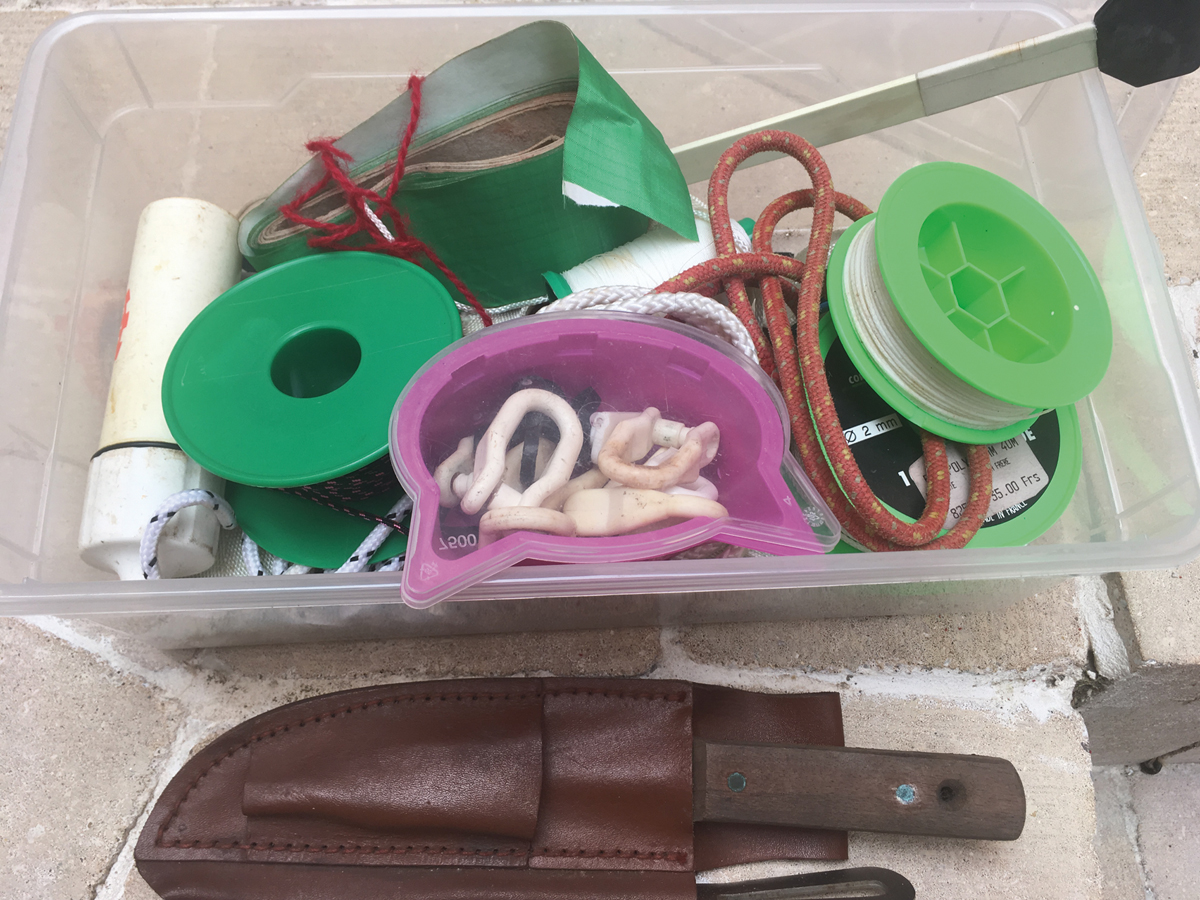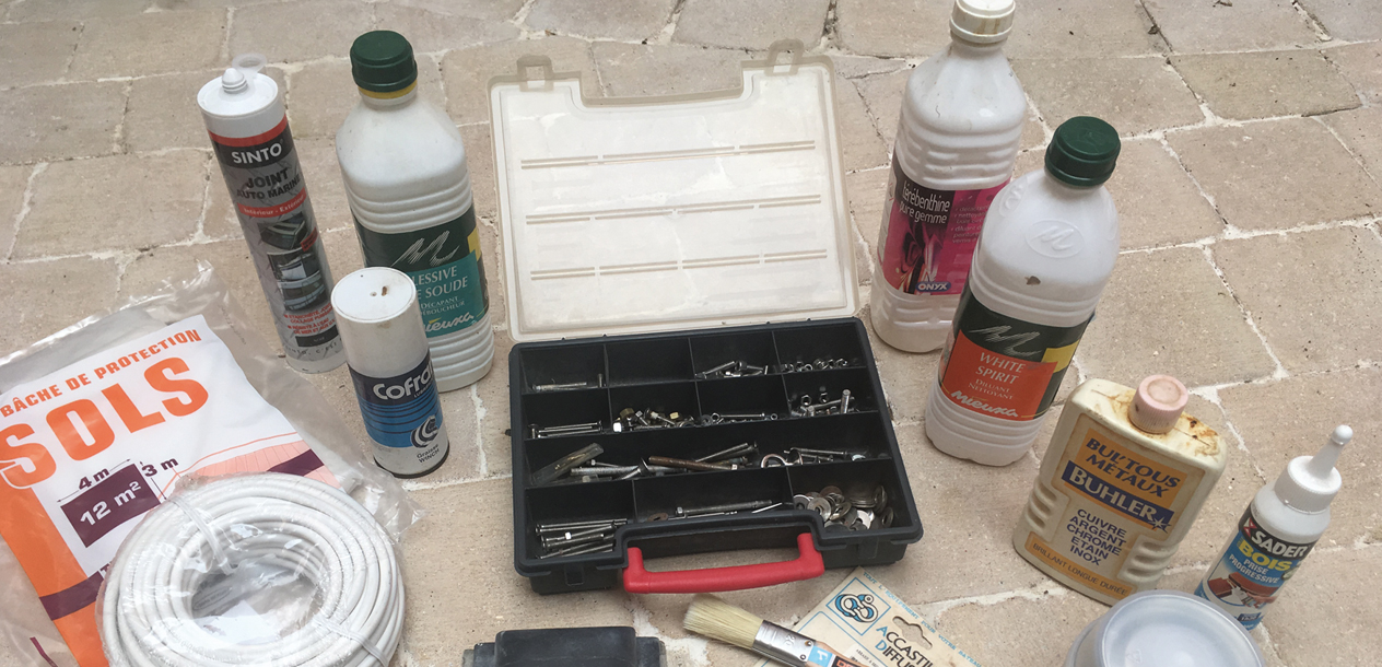 Le tout-venant et les consommables représentent une part importante de votre équipement de bricolage : ruban scotch plomberie, voilerie, électrique ; nettoyant, lubrifiant, dissolvant ; colles et résines, tissu de verre et contreplaqué marine ; bobines de fil électrique, cosses ; boulonnerie, visserie et quincaillerie ; là encore, la liste est longue, et un recensement minutieux des dimensions utilisées à bord sera nécessaire avant le départ, pour ne pas emporter de l’inutile…
