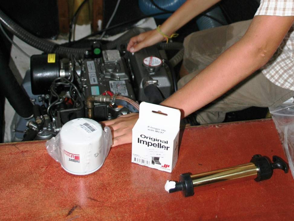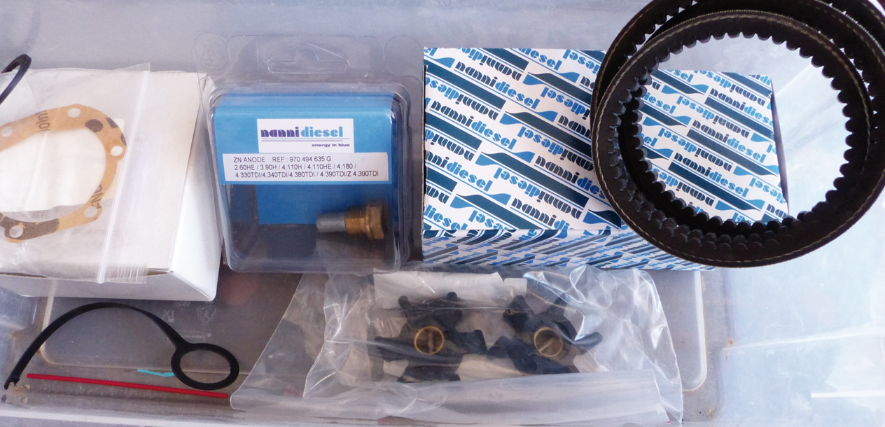 3 impellers (rouets) pour la pompe à eau de mer - 2 filtres gasoil pour le séparateur eau/gasoil - 3 filtres fins à gasoil sur le moteur - 6 filtres à huile - de l'huile pour 2 vidanges moteur - de l'huile pour 1 vidange inverseur - du liquide de refroidissement pour 1 vidange - 1 jeu de courroies de remplacement - 1 relais électrique pour le démarreur - 3 jeux d'anodes sacrificielles pour la coque - 1 anode moteur - 2 anodes du coupe orin - 2 anodes d'hélice - 3 coussins ou feuilles d'absorption d'huile pour mettre sous le moteur - 1 tube de graisse marine - 1 pompe à huile (le modèle Black&Decker à fixer sur une foreuse donne pour moi les meilleurs résultats, sans se fatiguer…) - 1 bidon de 10 litres pour recueillir les huiles usées, pour les faire recycler