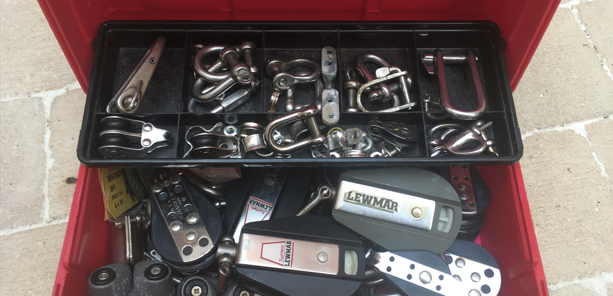 Les pièces de rechange et d'entretien courant des moteurs et du dessalinisateur sont bien sûr à embarquer, sous peine de les attendre de longs jours une fois au bout du monde, ou de les trouver à des prix vous autorisant à penser utiliser de l’huile de palme locale dans votre inverseur... Ce qui est fortement déconseillé ! Bref, mieux vaut avoir tous les filtres, courroies, anodes spécifiques à votre motorisation. Idem pour l’accastillage avec des poulies, manilles, cadènes et autres mousquetons, qui devront être adaptés aux efforts de votre gréement.