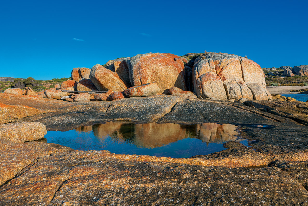 Après quelques jours d’attente, une nouvelle fenêtre météo nous permet de quitter St. Helens pour le nord de la Tasmanie. Nous mouillons dans Spike Bay, juste en face de l’île Spike qui nous protège de la houle. Plusieurs bateaux de pêche à la langouste y ont trouvé refuge, et nous retrouvons le bon samaritain qui nous a guidés vers St. Helens. Depuis le bateau, le paysage de ces rochers ronds colorés de lichens rouges posés sur un sol désertique est sublimé par le coucher de soleil. Lors d’une balade à terre, nous sommes envoutés par ce mariage de couleurs.