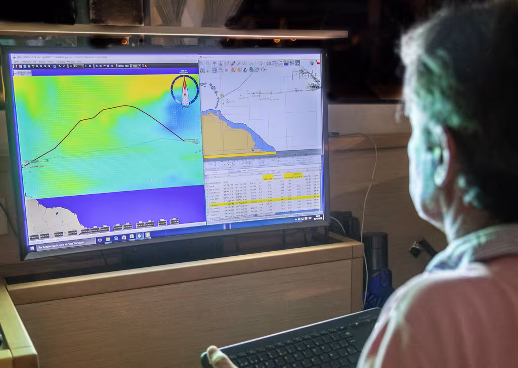 LecentrenévralgiqueestdanslecarréorganiséautourdelaTVdu bord.UnPC minuscule (computerstickINTEL delatailled'unegrosse cléUSB)surlequel tourneQTVLM pourleroutage,Open CPN pourlanav etlerepéragedes positions desautres bateaux,etExcelpourcalculerlesvitessesréellesdesbateaux(etnonpasseulement leVMG sur24 heures),quidonnentunebonneinformationsurleventréel,ainsiquelesévolutionsdes écarts entrebateaux.