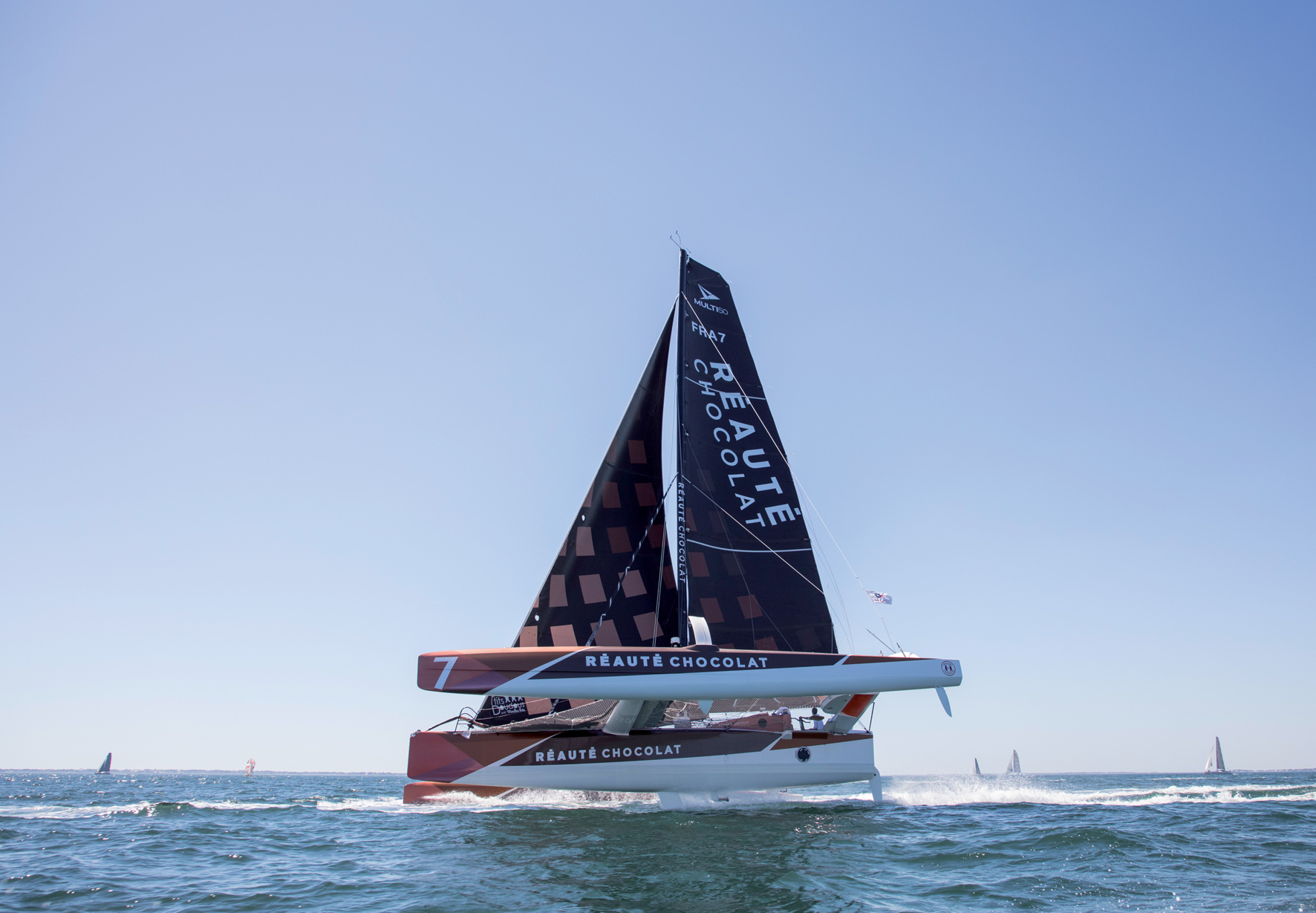 Nous venons de terminer notre qualif de 1500 milles avec Réauté Chocolat dans des conditions très variées, et notamment un passage du Fastnet avec 30 nœuds et 3 m de vagues, premier vrai test au large pour nous 2, et retour très positif sur le comportement du bateau dans la mer, l'électronique, le pilote, nos voiles embarquées. On revient avec une job list pleine en vue de la transat ! Après la mise à l'eau en avril, nous avons enchaîné les navigations en équipage en baie, en régates et entraînements avec aussi quelques sorties de relations publiques avec notre sponsor. Nous avons réellement commencé le double fin juillet, et cela va se poursuivre sur septembre et octobre, avec des sessions au large de plusieurs jours pour nous mettre dans le rythme, nous coordonner, appréhender les manœuvres et sensations de nuit, acquérir des automatismes, travailler nos réglages de pilote. Nous serons au départ de la Transat Jacques Vabre avec Vincent Barnaud ; cette course va aussi me permettre d’emmagasiner de l'expérience au large en équipage réduit et de certaines manœuvres en solitaire dans du vent léger. Nous partons avec l'ambition de donner le meilleur de nous deux. Je serai au départ du Rhum ; cette course s'est construite en 1978 sur la victoire hallucinante (98 secondes !) de Mike Birch à bord d’un petit trimaran jaune de 12 m face à Michel Malinovosky et son monocoque de 25 m ; un drame aussi : la disparition d Alain Colas ! Il y avait à cette époque une vraie excitation autour de la course au large, que le public et les médias découvraient en France. C’était aussi pour moi la première fois que je suivais une course au large ! Plus tard, je revois également très nettement Laurent Bourgnon passer devant moi en tête sur Primagaz dans l’édition 1990. Vivre un départ du Rhum en course est un moment très fort émotionnellement. Il y a 4 ans, le décor était somptueux, avec des grains noirs qui balayaient le plan d'eau ; le stress avec tous ces bateaux sur l'eau était bien présent. Après, c'est un format rapide de transat, donc plus facile à vendre à un sponsor, et quand on sait qu’un million de personnes passent sur les quais, ça ne laisse pas indiffèrent un partenaire qui veut se faire connaître et vivre une aventure humaine et sportive forte.
