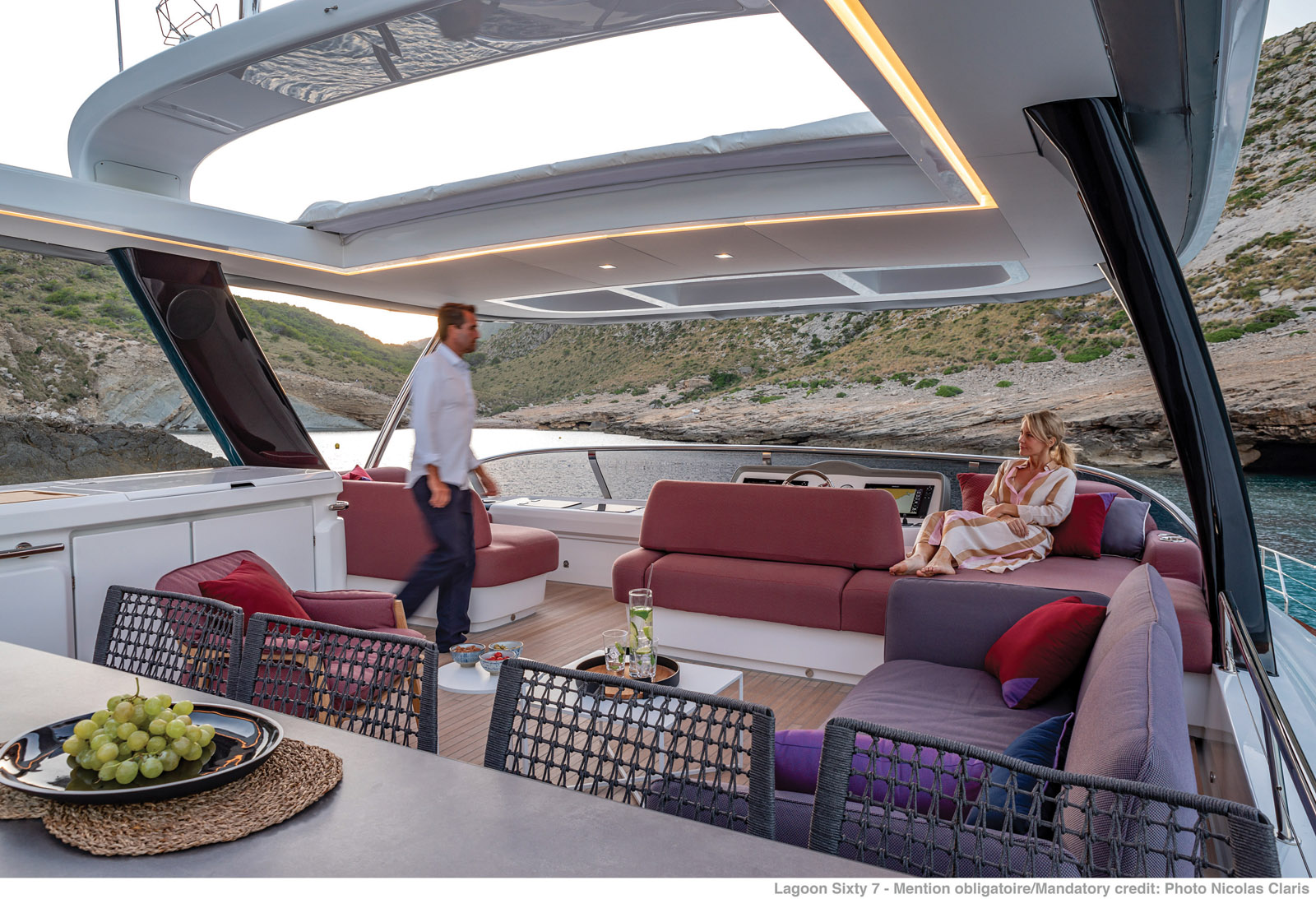 A gauche : le poste de barre intérieur est un vrai plus la nuit et par temps frais - Image de droite: l’absence de gréement permet de profiter pleinement du flybridge – ici, celui du Lagoon SIXTY 7.
