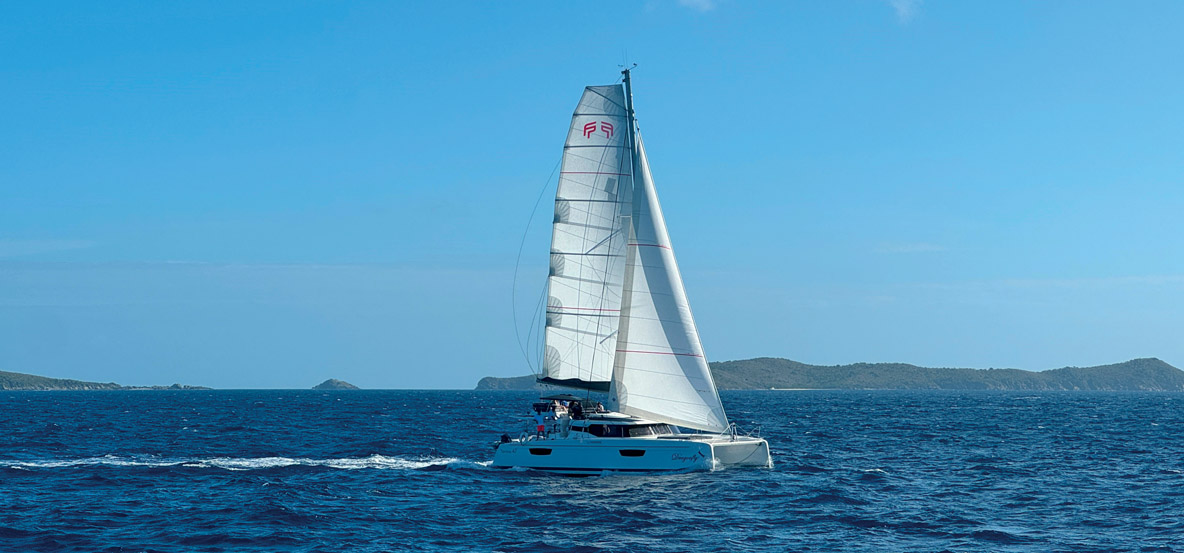 Arriver avant le début d’un événement qui réunit de nombreux multicoques présente un intérêt : il est possible de participer, par exemple, à un shooting photo depuis longtemps attendu. Si Fountaine Pajot assure d’ordinaire de généreuses productions de photos et de vidéos lors des lancements de chacun de ses nouveaux modèles, il y a eu un bug avec le Tanna 47, sorti à la fin de l’épisode de Covid-19. De fait, c’est le seul modèle du catalogue de la marque dont les photos d’extérieur se limitent à quelques vues au mouillage, avec le pont de l’île de Ré en fond… L’objectif de cette sortie qui s’annonce est de shooter des belles photos et vidéos sous voile. Pour l’occasion, c’est Romain Motteau, directeur délégué de Fountaine Pajot, qui prend la main – ou plutôt la barre : il choisit pour cette sortie d’utiliser Dragonfly, un des Tanna 47 les plus récents de la flotte Waypoints Yacht Charters. Romain est épaulé par Laurent Fabre, vice-président d’Atlantic Cruising Yachts, et mon Captain Jay pour manœuvrer le catamaran au mieux. Quelques figurants sont bien sûr de la sortie. Le ciel se partage entre nuages et éclaircies ; le soleil est justement déjà bien haut dans le ciel quand nous sortons du port, mais l’alizé est déjà bien établi. On est un peu à la limite d’utilisation des drones et le vent devrait forcir encore ces prochains jours – alors on y va ! Pour ma part, je suis chargé de la prise d’images depuis le chase boat. L’objectif est de naviguer au large des rochers appelés The Indians. Un premier shooting un peu mouvementé démarre ; on enchaîne avec des bords dans l’entrée de The Bight, un vaste abri de Norman Island. L’équipage du chase boat me dépose ensuite à bord du Tanna. Nous partageons un déjeuner-baignade à quelques mètres des grottes de Treasure Point. Le spot est parfait pour la pratique du wingfoil, ce qui n’échappe pas à Romain. Las, les ailes qu’il vient de louer sont percées ; les bords seront de courte durée.