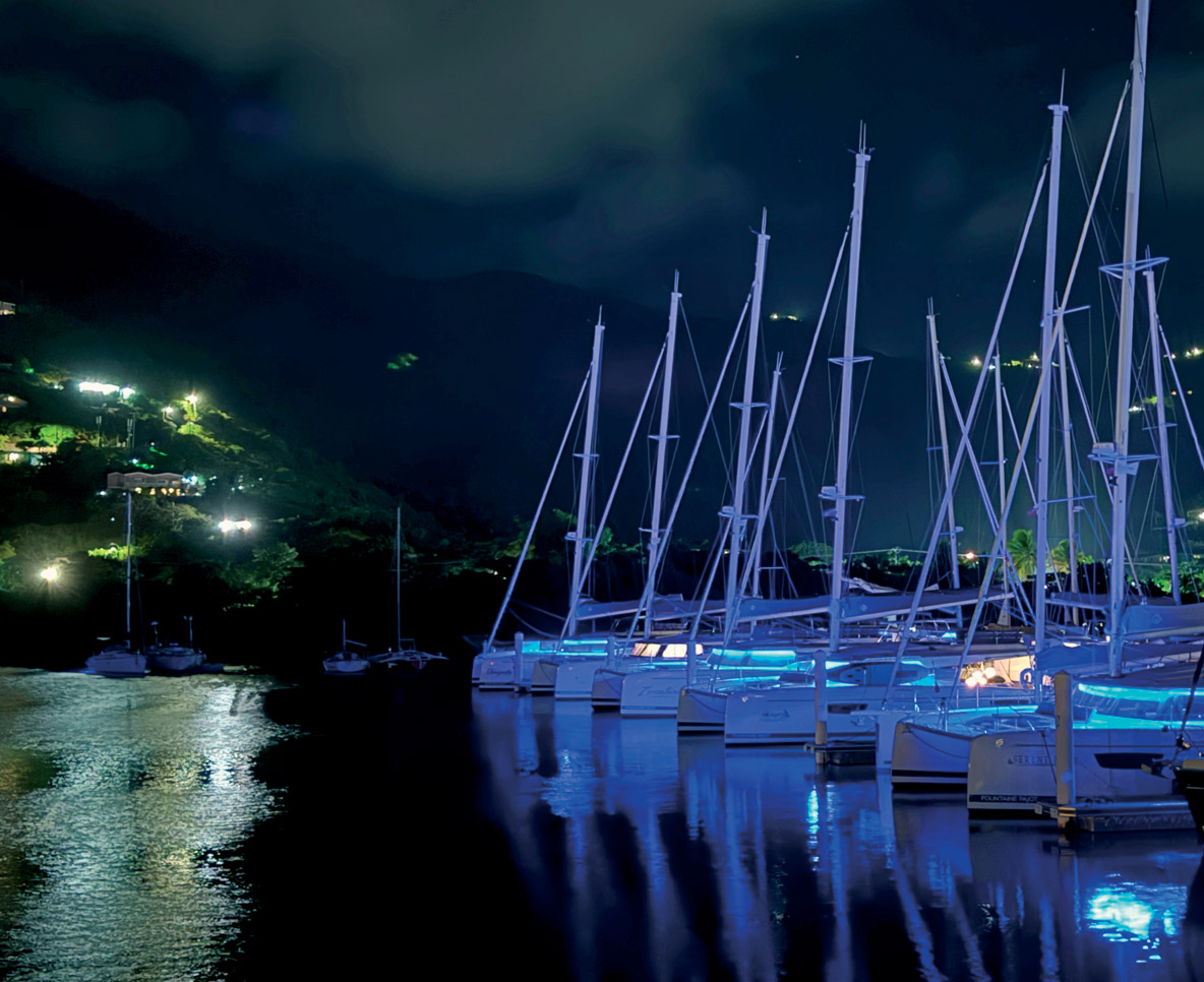 Avant le coucher du soleil, j’ai le temps de découvrir les 25 catamarans présents. Pour une grande majorité, ils appartiennent à des Propriétaires américains et sont exploités en location-gestion (principalement par Waypoints Yacht Charters et Navigare). Tous les modèles de la gamme actuelle sont représentés, ou presque – il manque le Samana 59 et le Thira 80. Le plus grand catamaran présent est donc un Alegria 67, propriété du Dr Keith L. Black, un neurochirurgien très réputé et basé à Los Angeles.
