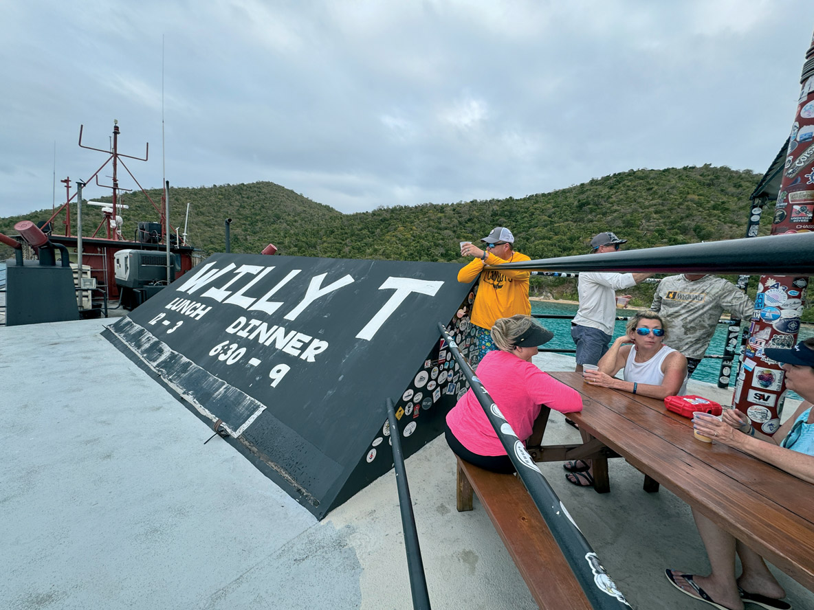 Le programme de ce Owners Rendezvous fait la part belle aux soirées ; pendant la journée, le seul impératif est de rejoindre l’escale suivante. J’opte vite pour une formule qui égayera ces courts convoyages : naviguer de conserve avec un autre Tanna 47 – ce sera Dragonfly, dont l’équipage franco-américain se réjouit d’avance de cette partition à deux. Nous quittons Nanny Cay en milieu de matinée. Le vent souffle entre 20 et 27 nœuds, aussi, nous prenons un ris et roulons quatre tours de génois. Dragonfly opte pour la même configuration de voilure. La navigation théorique est relativement courte, puisqu’il s’agit de revenir à Norman Island, que nous avions donc découverte la veille. Mais cette fois, nous nous arrêtons dans The Bight. Nous convenons avec Dragonfly de s’aventurer un peu loin au vent, jusqu’à Peter Island. Nous nous retrouvons pour partager de délicieux burgers. En raison de l’alizé musclé et de la forte houle de secteur est, de nombreux mouillages relativement exposés deviennent impraticables – et c’est logiquement vers des abris parfaitement protégés que la plupart des bateaux se dirigent en fin d’après-midi. Bref, il ne reste plus de corps-morts disponibles près de la plage quand nous retrouvons la flottille à Norman. Pas grave, nous nous retrouvons à quelques longueurs d’un drôle de bateau débordé par un grand ponton et surplombé par une terrasse ; bienvenue au Willy T ! Ce bar flottant est une véritable institution aux BVI. A 17 h, on compte déjà les annexes par dizaines. La plupart des clients sautent ou plongent, enjambant sans sourciller le grand panneau « No jumping No diving ». Mary et Ann se préparent pour la soirée déguisée corsaire. Je pensais échapper à ce genre d’accoutrement en tant que journaliste, mais non : j’ai droit à un kit complet avec bijou de pacotille et sabre en plastique… Que la fête commence à The Bight at Norman Island, un grand établissement en partie privatisé pour cette soirée Fountaine Pajot.