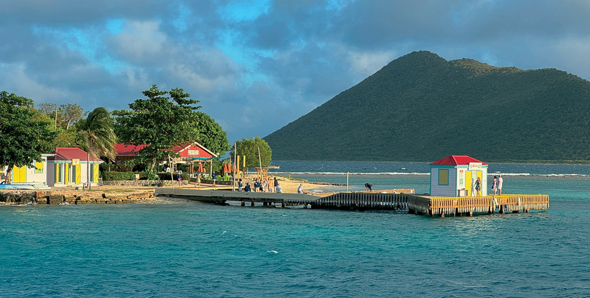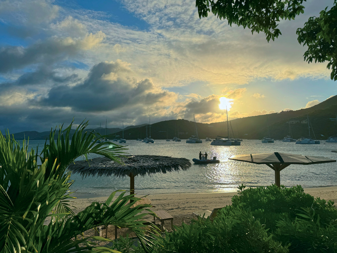 Le programme du jour est de rejoindre l’extrême est de Tortola. Le vent, toujours calé à l’est-nord-est, ne mollit pas ; nous décidons, après un nouveau passage à Peter Island, de découvrir Cooper Island. Cette petite île abrite un hôtel haut de gamme, lequel intègre un restaurant et un bar à rhum, tous deux ouverts aux plaisanciers à l’escale. Le mouillage est un peu rouleur et soumis à des rafales imprévisibles mais l’escale est franchement séduisante. En début d’après-midi, nous renvoyons les voiles pour rallier Marina Cay ; ce minuscule îlot situé à moins d’un mille au nord-est de l’aéroport a été longtemps célèbre pour son bar-restaurant et sa station-service façon case créole. En septembre 2017, Irma, l’ouragan le plus puissant jamais enregistré dans l’Atlantique, réduit en miettes ces installations. La station-service sera reconstruite, mais cessera rapidement son activité. Aujourd’hui, Marina Cay est de nouveau opérationnelle, avec sa plage de charme, ses parasols de paille, et bien sûr son restaurant. En fin de journée, la lumière est magnifique grâce à l’exposition ouest. Le mouillage est très vaste et comprend de très nombreux corps-morts. 25 ont heureusement été réservés pour nous – la nuit, attention à la circulation de nombreux bateaux et annexes. Après le dîner et un dernier verre à bord de Dragonfly, nous regagnons nos cabines.