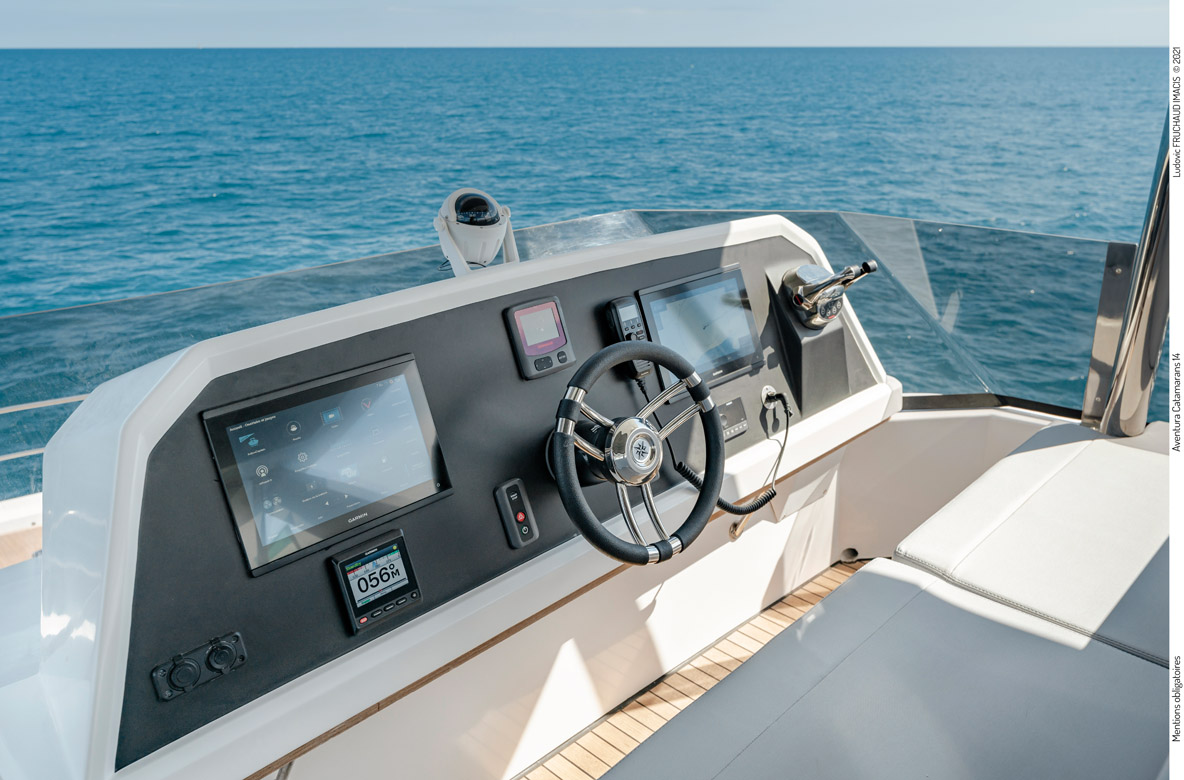 La carène dessinée par Philippe Briand et la motorisation contenue à 2 x 320 CV pour 20 tonnes en charge assument une vitesse maximum proche de 20 nœuds. La zone de vie rassemble un salon, la cuisine et une timonerie. La grande cabine avant est une réussite. Dans les coques, les cabines encastrées profondément entre le plancher central et le fond de la nacelle sont inédites à bord des powercats de cette catégorie.