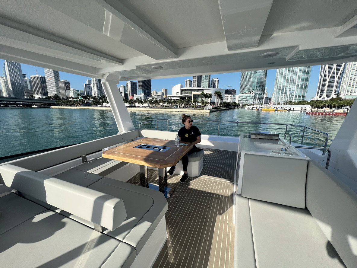 Le Whisper 50 devrait être capable d’assurer une propulsion « propre » à 5/6 nœuds. Le powercat peut bien sûr naviguer plus rapidement – jusqu’à 14 nœuds –, mais là, une recharge des batteries est nécessaire grâce au générateur et à la prise de quai. Le plan de pont ne semble pas privilégier avant tout la surface des panneaux solaires – de nombreuses zones restent bien dégagées.