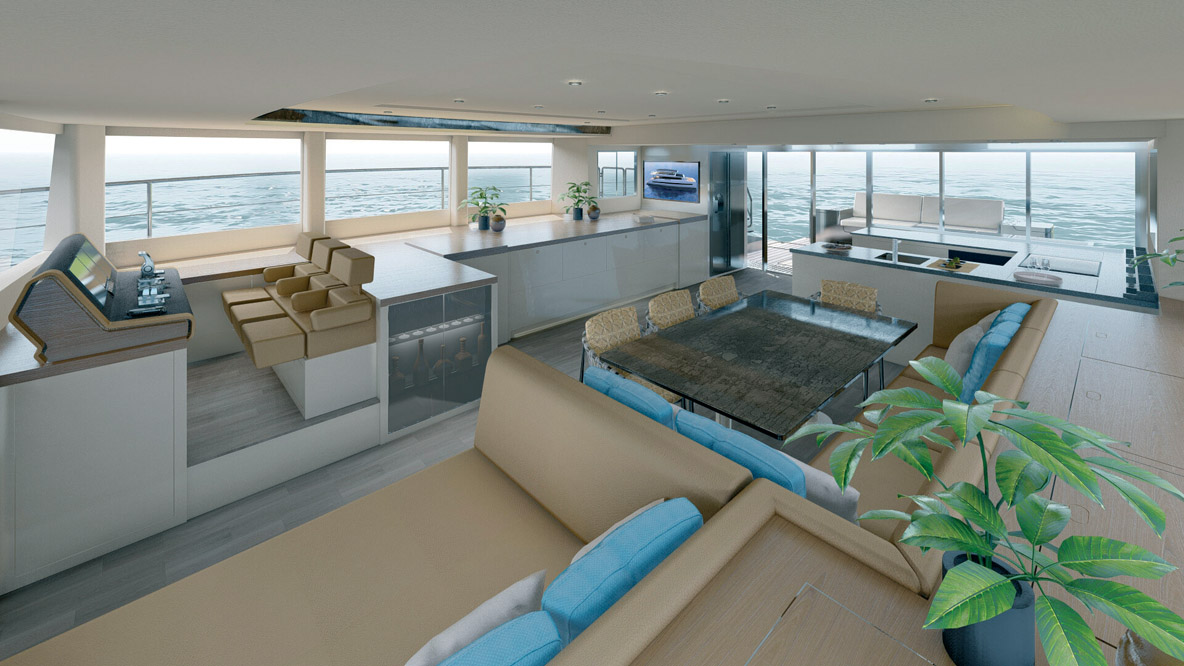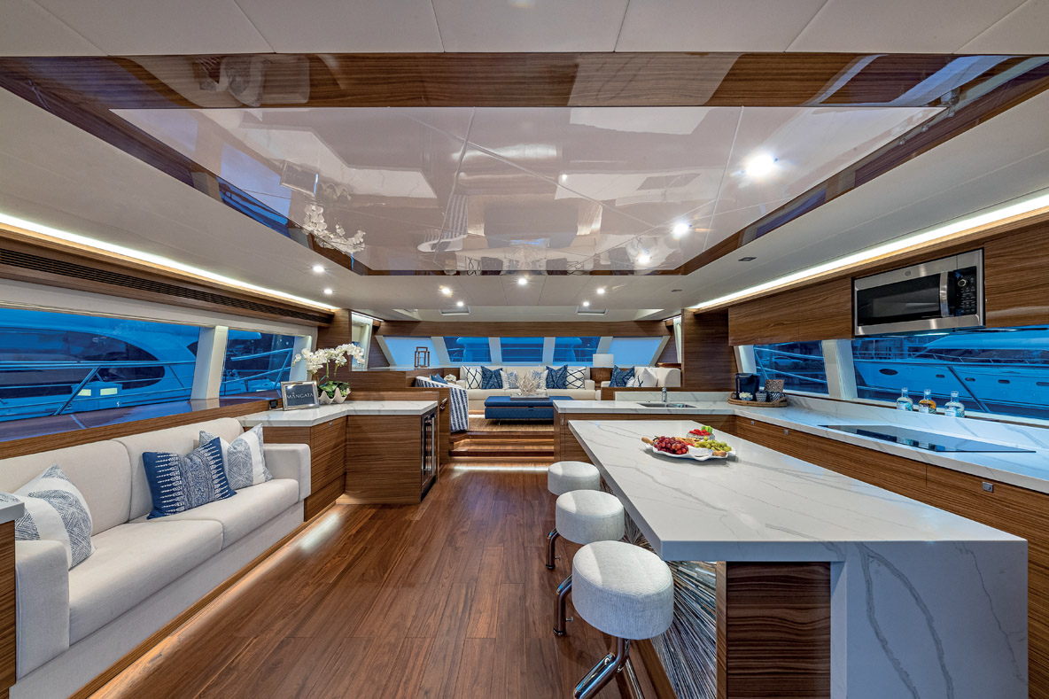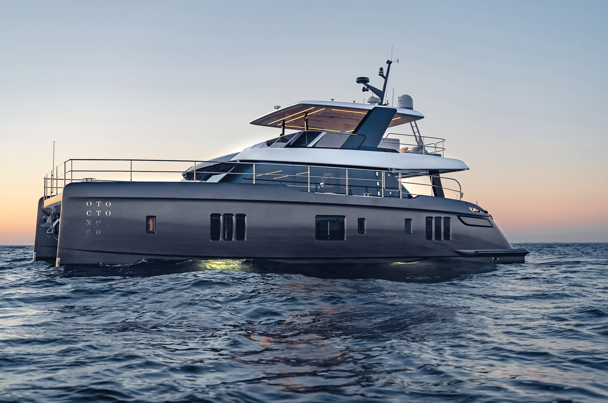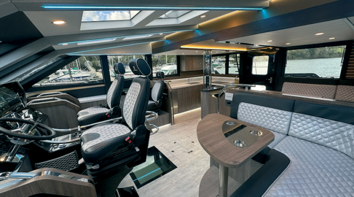 On relève également un très gros effort consenti au design, aux matériaux employés et à la qualité de finition, à l’image de l’accès au flybridge depuis l’intérieur entouré de verre pour ne pas casser les perspectives, le bar entre les deux ouvertures arrière ou encore la plate-forme hydraulique qui peut faire office de terrasse au même niveau que le cockpit. Si la M8 n’est pas un powercat semi-custom, différentes options comme la cuisine en coursive permettent de personnaliser ce nouveau modèle. Le constructeur fait un pas vers le respect de l’environnement avec une option Silent Yacht : un pack batteries lithium associé à des panneaux solaires permet de passer une nuit à bord sans faire tourner le générateur.