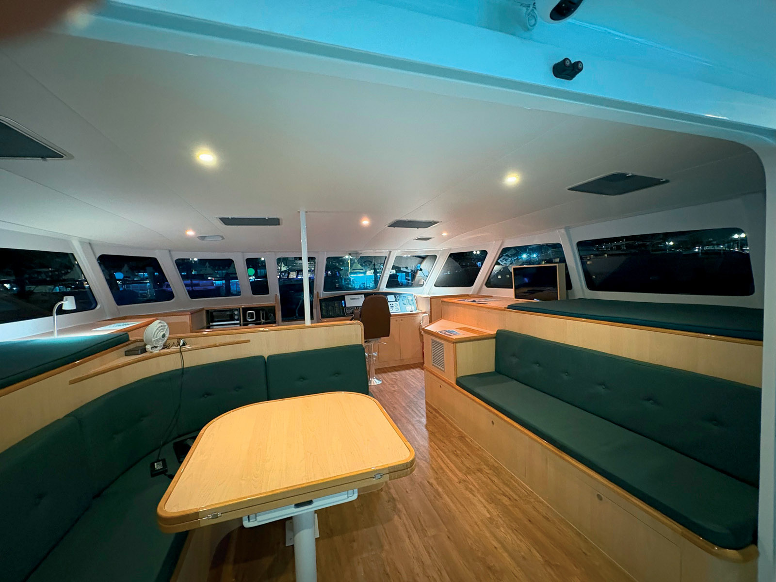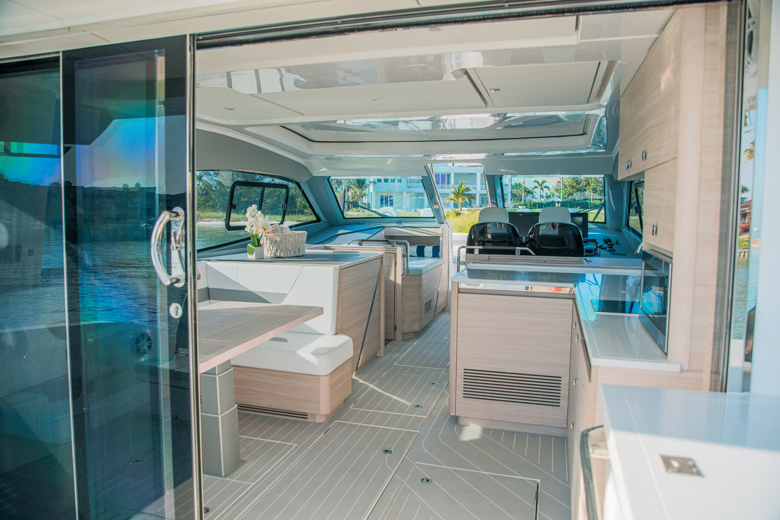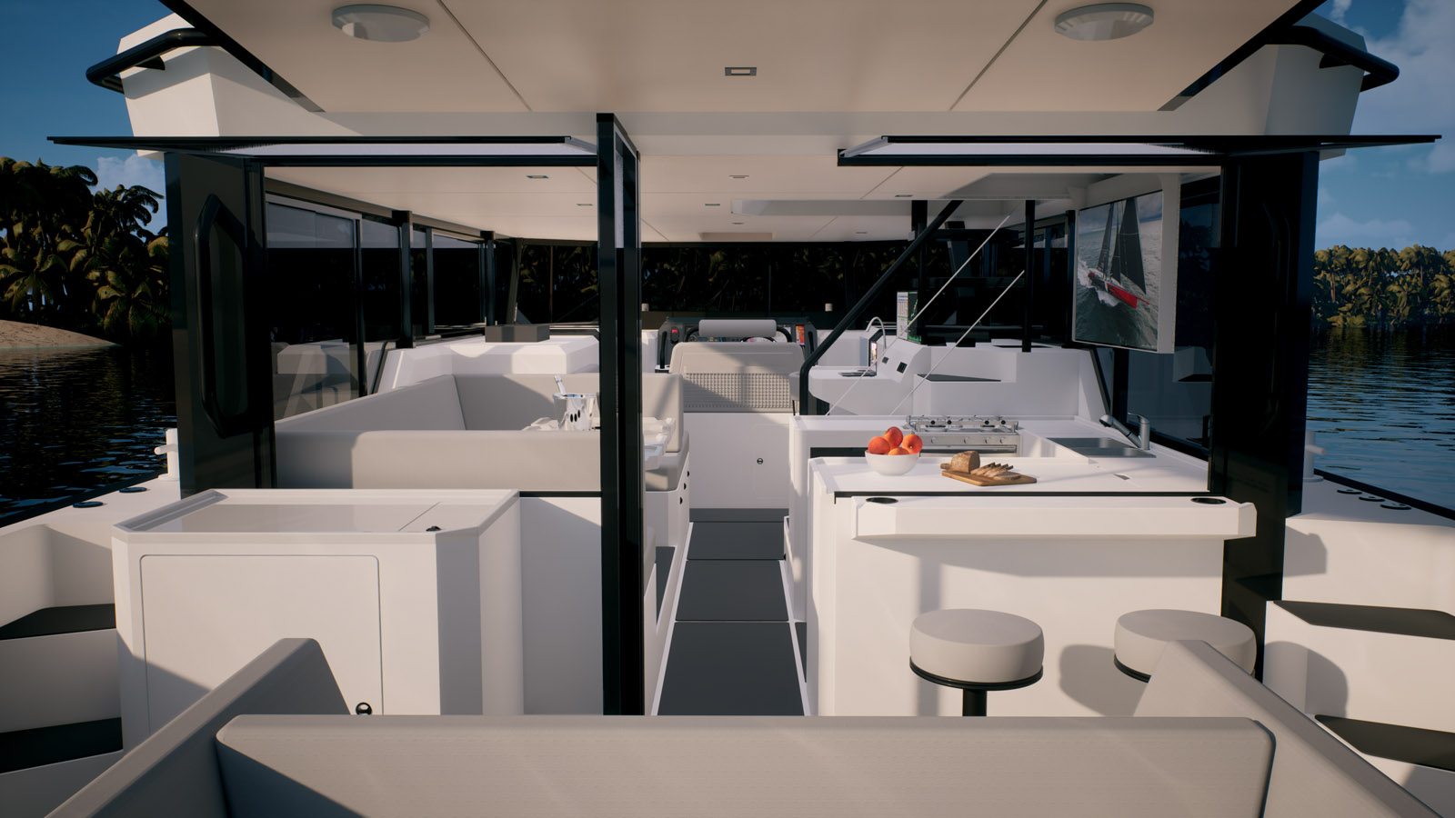 Le plan de pont fait la part belle au farniente, avec des grands solariums à l’arrière et un cockpit avant. Un bon point enfin pour le généreux équipement proposé en standard.