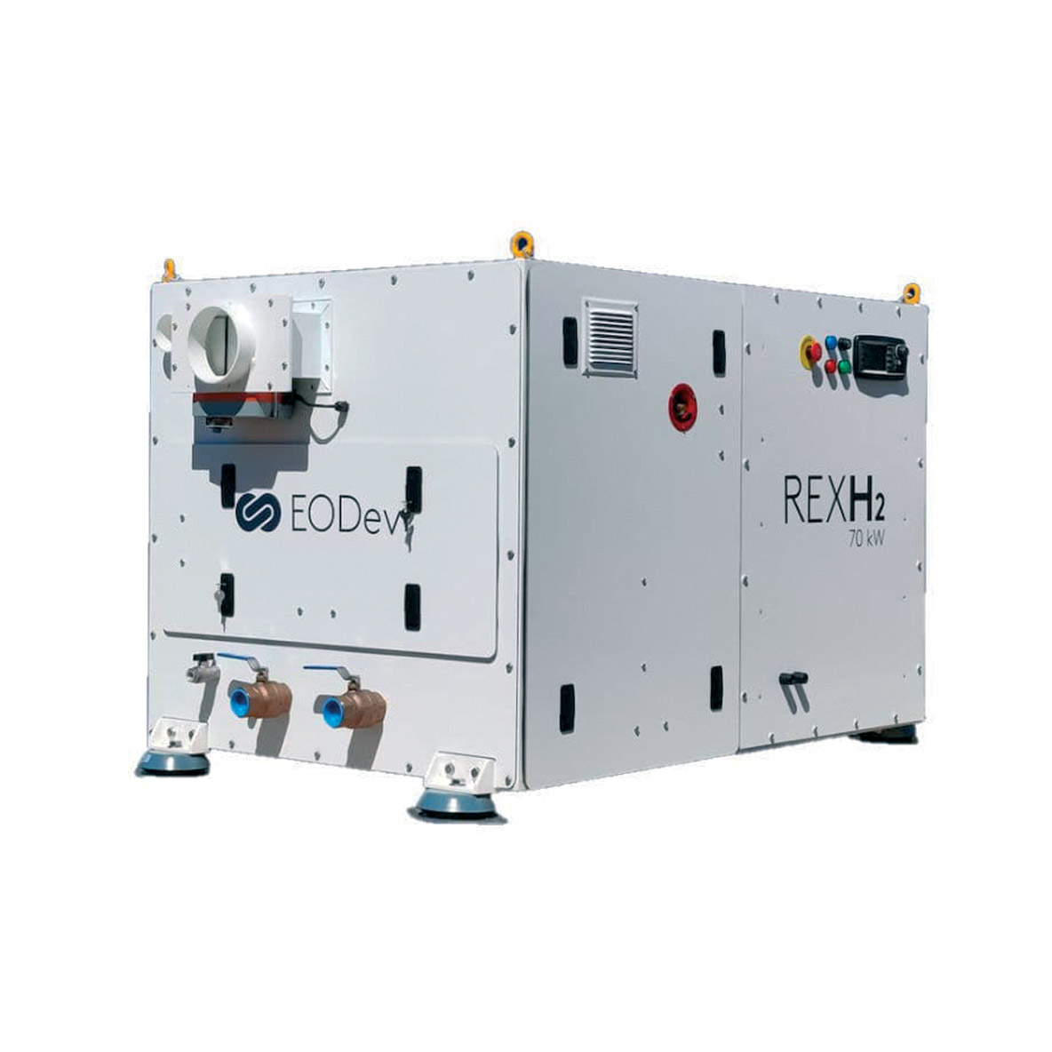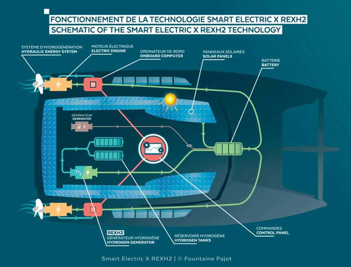Selon l’architecte Marc Van Peteghem, les ailes Oceanwings d’Energy Observer sont capables d’assurer une vitesse moyenne de quinze nœuds à la plate-forme très performante. A cette vitesse, bien supérieure à celle que nos catamarans de croisière de grande série – y compris les plus grands – peuvent atteindre, la production hydroélectrique est très importante (environ 4 kWc, soit potentiellement 100 kWh de production sur 24 heures). Cette énergie permet d’assurer le cycle de production d’hydrogène. Quand il n’y a pas assez de vent, ou quand, au début de son périple, Energy Observer n’était pas encore équipé de ses ailes, la seule solution était de produire l’hydrogène quand le catamaran était branché au quai. La longue mise au point qui a été réalisée pendant les grandes traversées de ce multicoque expérimental depuis 2017 a permis la création de EODev ; cette société a réalisé, en partenariat avec Toyota, le développement de REXH2, la première pile à combustible destinée au marché de la mobilité individuelle – et donc de la plaisance par extension. Un premier prototype de bateau à moteur électrique a été réalisé en 2021 avec la société Hynova pour valider le concept et poursuivre les recherches. En 2023, c’est Fountaine Pajot qui en installe une à bord d’un Samana 59 destiné à la société de charter Tradewinds. Cette année, Sunreef Yachts a également exploité la fameuse pile à combustible REXH2 à bord d’un 80 ECO zéro émissions.