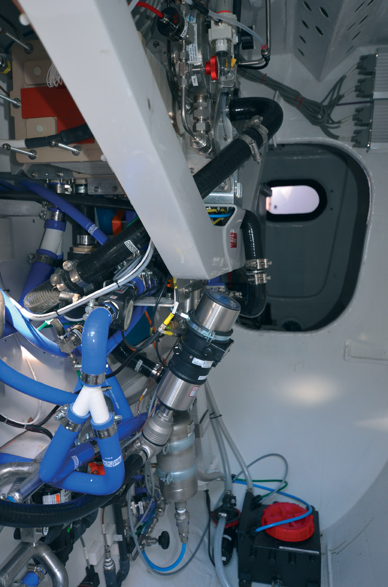 Les 7,5 kg d’hydrogène sont stockés à 350 bars dans des réservoirs spécifiques en carbone – chaque tube ne pèse que 30 kg ! L’autonomie électro-hydrogène est de 40 heures au mouillage et de 10 heures à une vitesse de 5 nœuds.