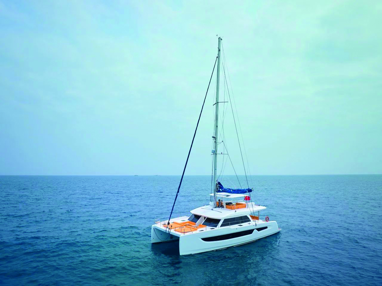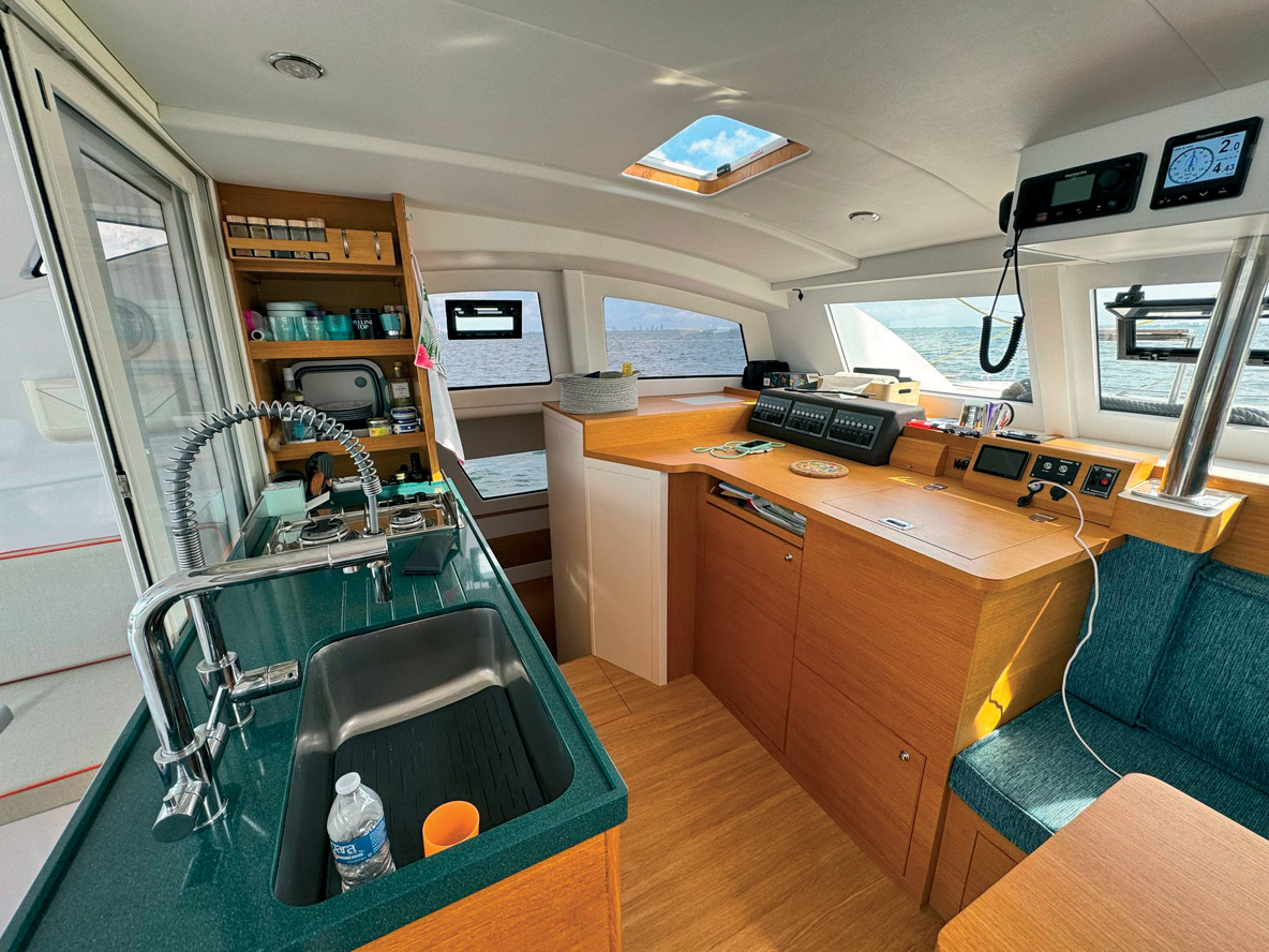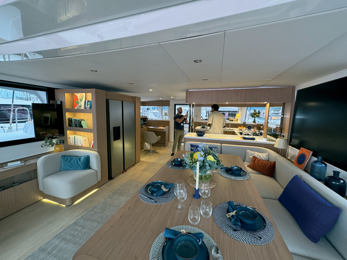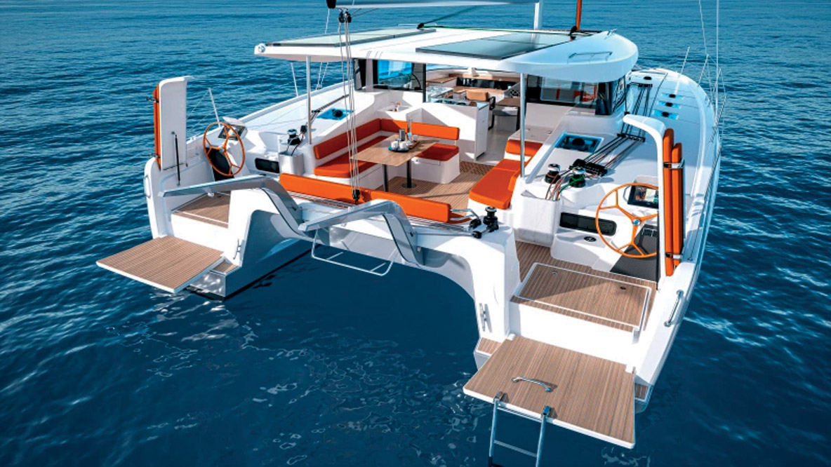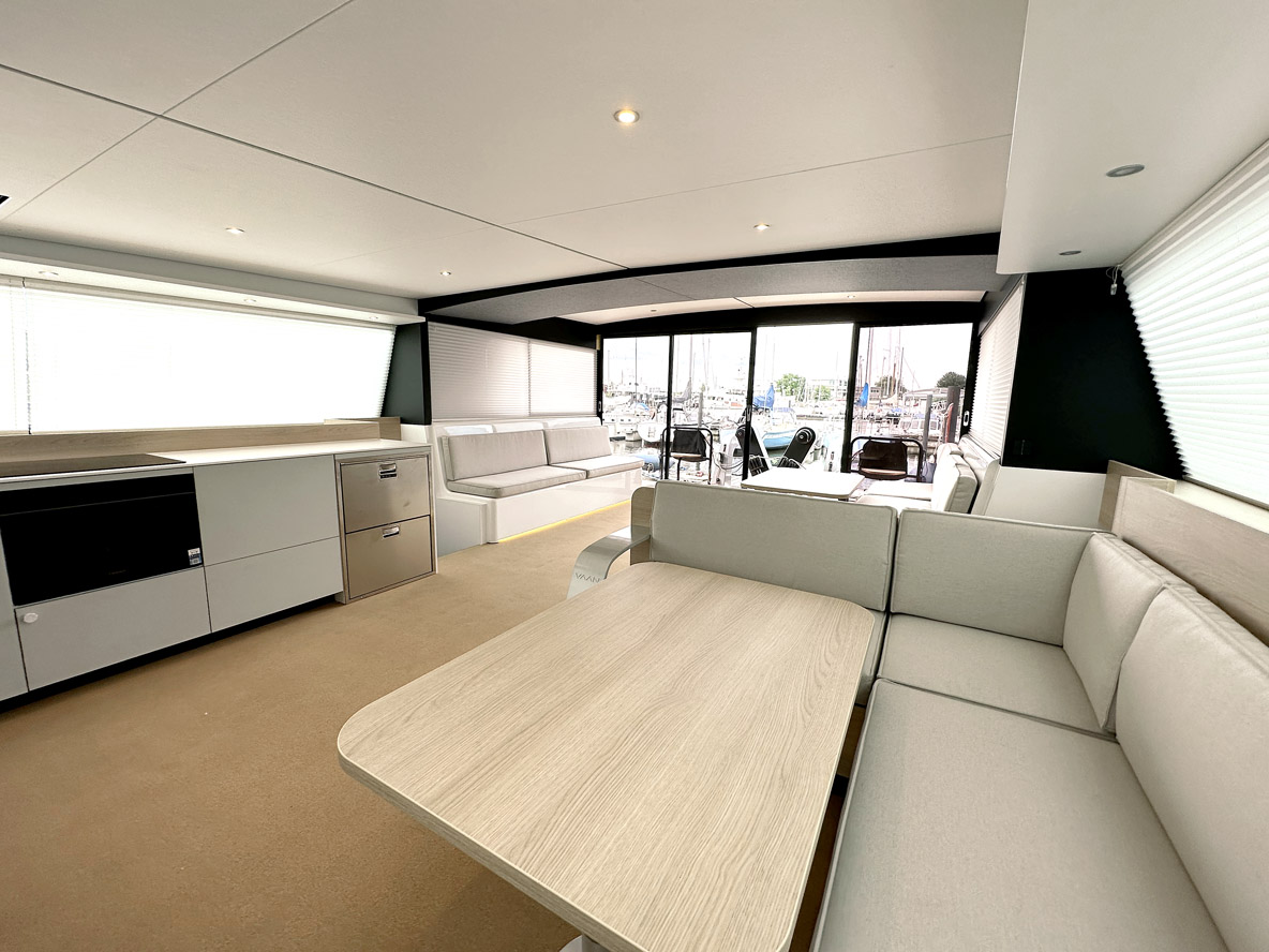 un catamaran d’entrée de gamme qui en donne déjà beaucoup en ouvrant les portes du grand large et en offrant un confort maximum pour sa taille. On remarque un rouf très reculé qui rappelle la génération précédente – plus étonnant encore, le solent autovireur reprend du service ! Au chapitre des vraies innovations, on note la réserve sur l’extérieur de la coque qui intègre – et protège – les grands hublots. Les jupes arrière, quant à elles, offrent une largeur maximum pour faciliter l’accès à bord et inviter à la baignade au mouillage.