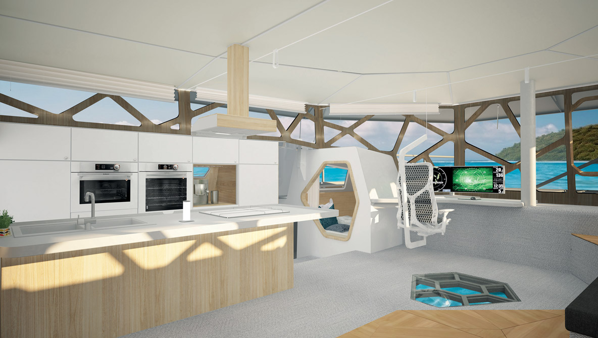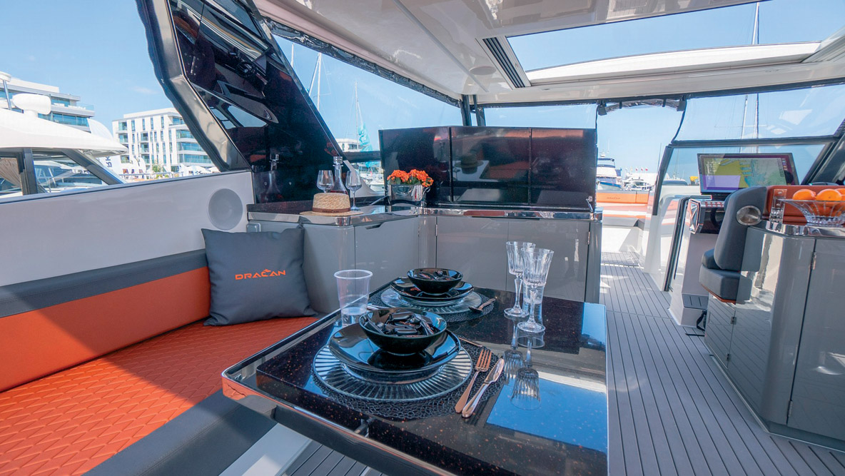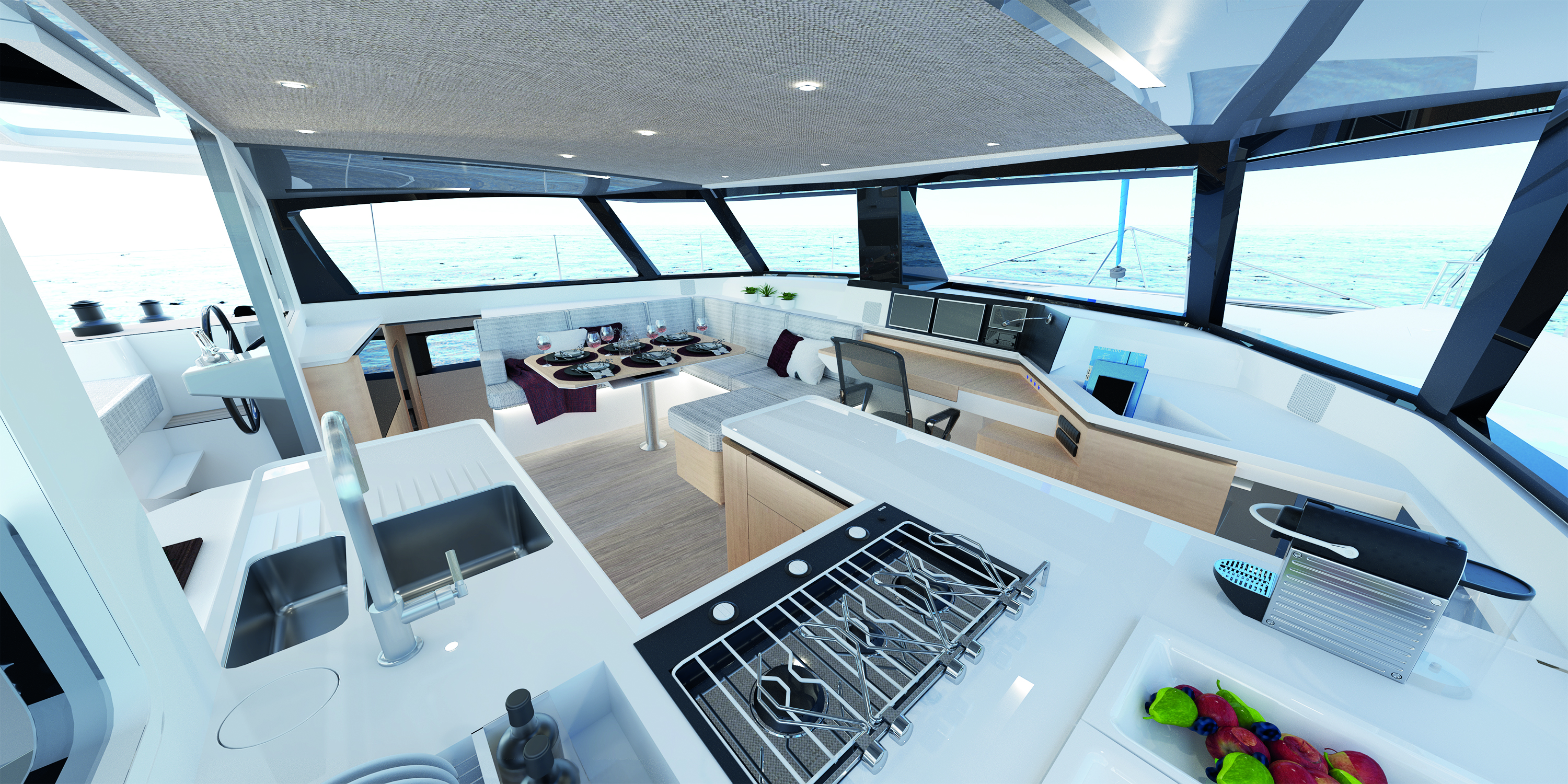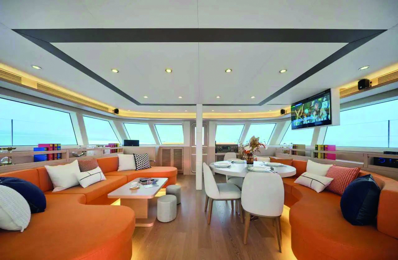 Au chapitre des changements, on note qu’un banc arrière confortable et une table plus longue de 35 cm ont été ajoutés dans le cockpit. On découvre également des bossoirs et les barres à roue en composite, tandis que le bout-dehors et le bimini sont en carbone. Les aménagements se déclinent de 2 à 4 cabines avec 2 salles de bains. Le cockpit peut être entièrement fermé avec des panneaux en tissu ou en composite amovibles. Cette formule permet de doubler la surface du carré.