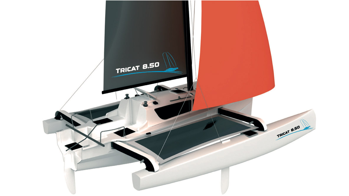 Spécialiste depuis 2002 du trimaran repliable de mois de 30 pieds, Tricat lance son 850, remplaçant du valeureux 25. Toujours repliable, bien sûr, ce nouveau trimaran est logiquement bien plus moderne que son prédécesseur, ajoutant également une touche de confort et d’agilité. Les dérives relevables sont greffées sur les flotteurs, libérant la coque centrale. Quant au capot de descente, il dispose de 3 positions et peut être complété par une capote et un taud de soleil.