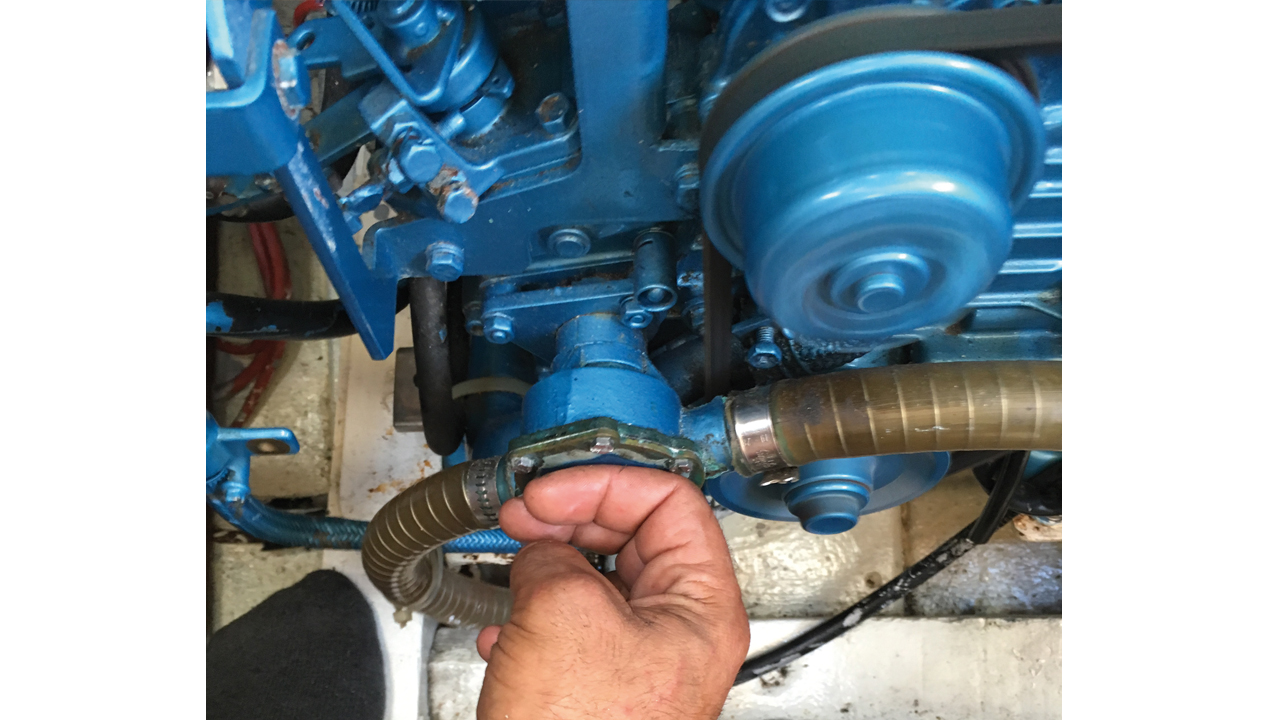 7- En premier, on pose la main sur le couvercle de la turbine. Il doit être froid. S'il est chaud, c’est que l’eau de mer censée refroidir le moteur ne passe plus…