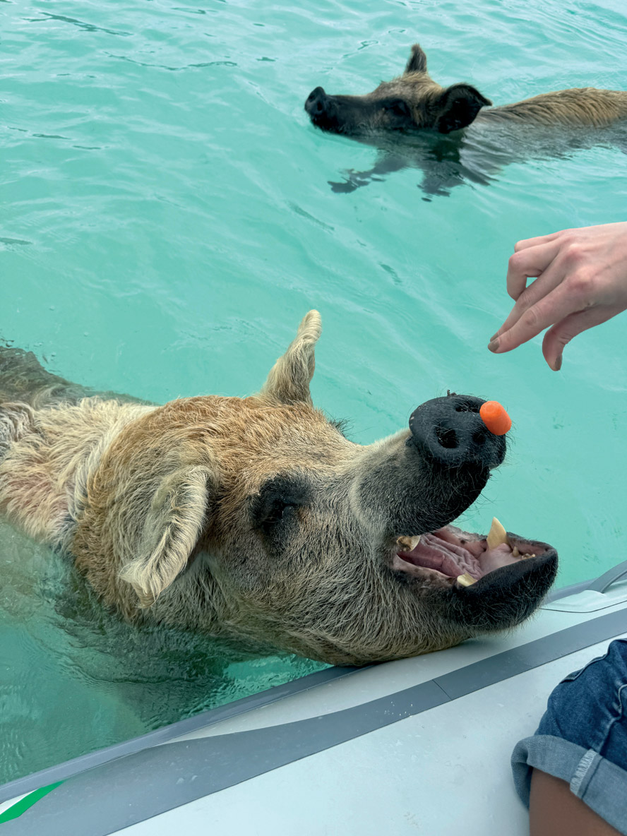 La journée a commencé avec un peu de navigation pour arriver jusqu’à Pig Beach, une plage entièrement remplie de cochons. J’avais déjà vu des vidéos sur les réseaux sociaux avec ces cochons qui nageaient, et j’étais super enthousiaste à l’idée de les voir de mes propres yeux. On a tous pris l’annexe, et des cochons étaient en train de nager lorsque nous sommes arrivés. Il y en avait un peu partout dans l’eau et ils se sont tous précipités autour de nous. Nous avions prévu des carottes pour les nourrir, et même si beaucoup d’entre elles se sont retrouvées dans l’eau, nous arrivions quand même à en lancer quelques-unes dans leur gueule. Ils l’ouvraient en grand pour nous montrer leurs énormes dents. Elles étaient super pointues et les quatre de devant étaient plus grandes que le reste ; du coup, nous évitions de mettre nos mains trop près.