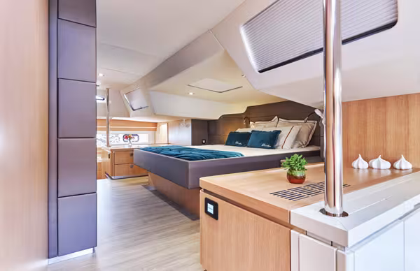 Gilles reconnaît d’emblée que, du point de vue écologique, « la climatisation, ce n’est pas le top », mais, à bord de ces catamarans haut de gamme dont le déplacement est conséquent, le poids d’une installation complète de climatisation et l’énergie nécessaire à son fonctionnement ne représentent qu’un inconvénient minime par rapport aux avantages identifiés. « Il s’agit de l’utilisation de nos catamarans, détaille Gilles. La plupart de nos clients partent en famille vers des régions chaudes comme la Méditerranée, ou tropicales comme les Antilles. Là-bas, ils entendent garder le confort au niveau de standing du catamaran, et surtout profiter de la chaleur, mais ne pas en souffrir. Chacun sait que les voyageurs restent au mouillage 80 % du temps, et un bon mouillage n’est pas forcément ventilé par vingt noeuds de vent comme en navigation. L’exposition à la chaleur et à l’humidité est donc importante. De plus, passé le crépuscule, les courants d’air sont tout de même souvent plus rares. Nos bateaux sont équipés de climatisations 57 000 BTU qui peuvent rafraîchir le bord en une demi-heure. Ces 30 minutes coïncident, de toute façon, avec le temps d’allumage du générateur pour la production d’eau et la recharge du parc batteries qui est à la mesure du confort à bord. Au-delà du bienêtre, il y a l’aspect de la maintenance du navire. La climatisation sert aussi à déshumidifier l’intérieur afin d’éviter toutes traces de moisissures sur les meubles, vaigrages, mais aussi la literie, le linge et les effets personnels. C’est plus agréable d’aller au restaurant avec une chemise bien propre qu’un tee-shirt poisseux. Dans certains cas, cela peut même servir pour le linge sortant du lavage et qui ne sèche pas à cause de l’humidité. En maintenant une température très agréable, il n’y a plus besoin d’ouvrir panneaux, hublots et portes, ce qui permet de vivre sans les insectes comme les moustiques, ou de ne pas en laisser entrer d’autres, comme les blattes et les cafards. Dans une ambiance tempérée, les aliments et le vin se conservent mieux également. Sur nos unités, les clients qui ne l’avaient pas choisie auparavant la font installer après deux ans de navigation. Maintenant, on la propose même aux plus réticents, et le retour est sans équivoque, ils sont tous très heureux. »