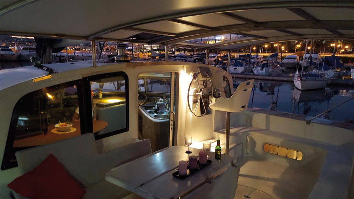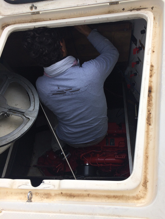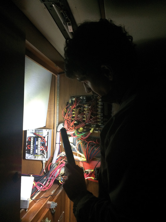 Nous avons fait la route d’un trait le vendredi soir, et avons attaqué la préparation dès le lendemain matin. J’avais une boule au ventre pendant tout le trajet ; un mélange d’appréhension et d’excitation qui ne s’est guère arrangé une fois à bord. Une des cabines était remplie à ras-bord d’effets personnels, moisis pour la plupart, que nous avons sortis et étalés avec soin sur les trampolines pour qu’ils sèchent à l’air libre, avant de les ranger correctement dans le carré. Dans cette cabine, nous soupçonnions déjà un problème d’humidité – peut-être de la condensation, ou une petite voie d’eau ? Nos craintes se sont confirmées, et l’importance d’une expertise indépendante aussi. Une fois la voie libre, j’ai commencé à isoler les lampes murales, et à enlever les panneaux qui permettaient d’accéder aux réservoirs de gasoil ; la conception des Lagoon 47 est telle que cet accès ne peut se faire que par les cabines arrière, car les réservoirs se trouvent enfermés sans trappe sous le cockpit.