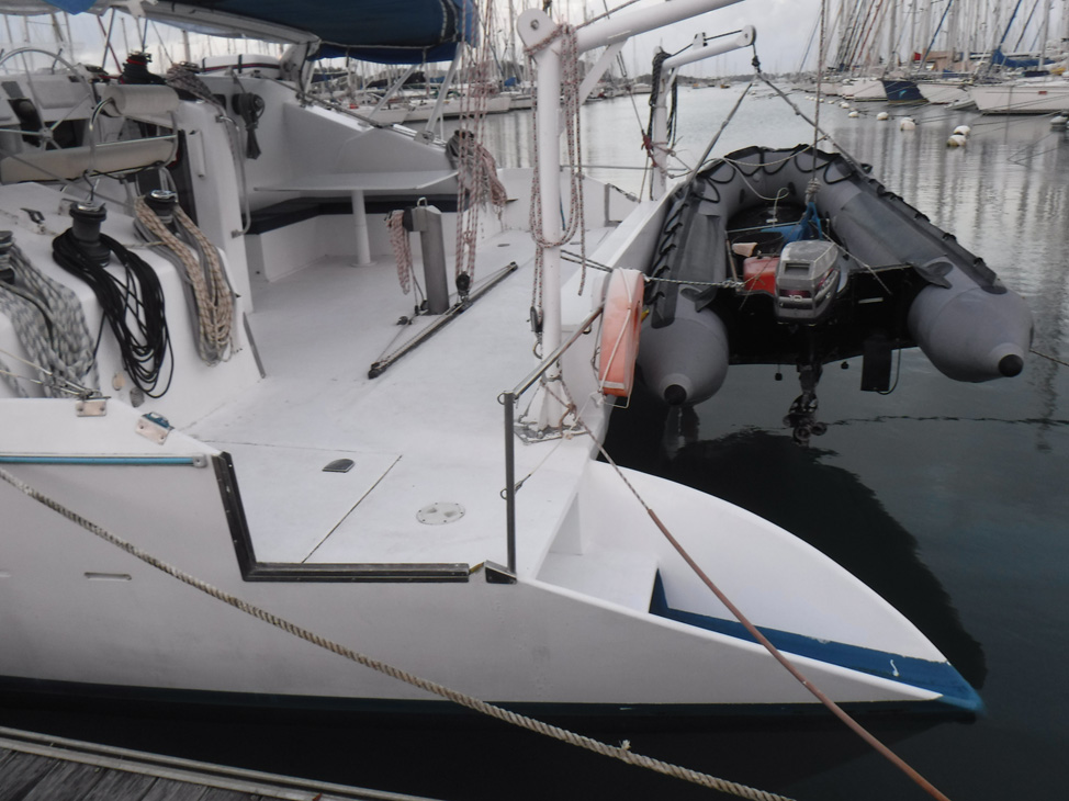 Entre-temps, j’avais été débauchée, et jusqu’à notre départ je devais travailler sur la construction d’un des plus gros yachts privés du monde, sur un chantier en Allemagne. Avec Henrique, nous avons donc fait des visites virtuelles du catamaran, grâce à des appels Skype avec les deux femmes qui en étaient propriétaires, et nous sommes tombés sous le charme de ce bateau atypique, son histoire et les possibilités qu’il présentait à notre projet. Le seul problème ? Il se trouvait en Martinique ; les propriétaires ont insisté (et nous étions d’accord) sur le fait que nous ne pouvions pas l’acheter sans l’avoir vu. Le moment n’aurait pas pu être moins bien choisi ; c’était le début des vacances scolaires et les vols étaient hors de prix, mais, après quelques calculs, nous nous sommes dit que le voyage rentrait quand même dans notre budget d’achat, et que ce serait bête de manquer une vraie affaire pour ce qui ne représenterait finalement qu’un petit pourcentage du prix du bateau. Henrique a donc réservé son billet aller-retour, avec seulement 23 heures sur place.