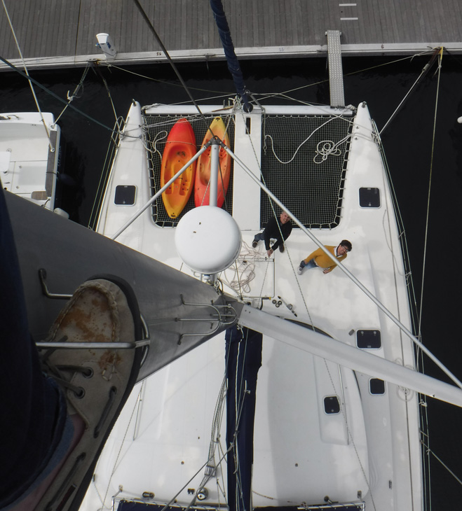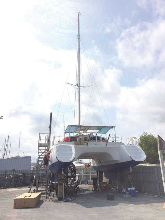 Mais après la tempête, il y a toujours le soleil, et nous avons eu la bonne surprise d’apprendre qu’un cata que nous avions visité au mois de novembre était toujours à vendre. Il ne figurait plus sur notre liste, car le propriétaire ne souhaitait pas le sortir pour l’expertise avant le printemps, histoire de profiter de la manutention pour refaire l’antifouling si jamais la vente ne se faisait pas. Dix jours plus tard, nous nous retrouvions sur la navette de nuit pour la Corse (cette fois-ci, nous avons pris l’option "petit budget" : coucher sur les banquettes d’un bar, avec une bouteille de rhum, une couverture et des bouchons d’oreille !) Nous avons tout regardé de A à Z lors de la visite : monter au mât, plonger sous le bateau avec masque et tuba pour voir l’état de l’antifouling (inexistant…), et rédiger une liste de travaux avec l’aide du vendeur.