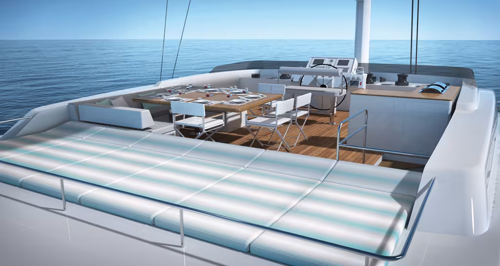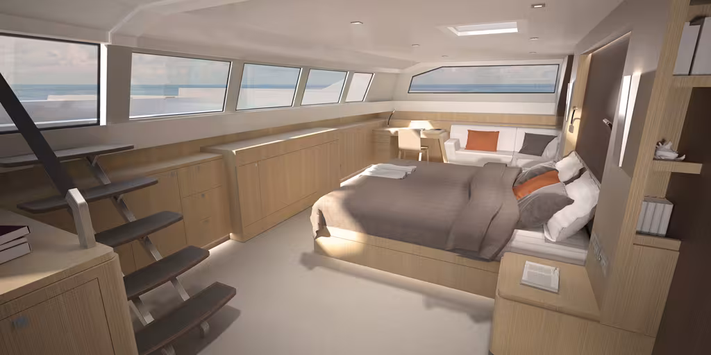 Issu du chantier JFA expérimenté dans la construction de yachts custom luxueux et très solide, ce catamaran semi custom en aluminium et composite présente tous les atouts pour de grandes croisières voire l’exploration dans un confort absolu, silence de fonctionnement, absence de vibrations. Ses bonnes proportions compactes vues de l’extérieur offrent néanmoins des prestations d’un yacht de 150’. La cabine panoramique de l’armateur à l’avant de la nacelle avec son accès sur le trampoline avant est très vaste et n’occulte pas la vue sur mer depuis le salon. Un deuxième est en construction et une version S 10 est sur la planche à dessin.