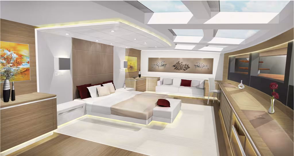 Lancée en 2010 avec le 102’ puis le 82’qui comportait un jacuzzi intérieur dans la cabine propriétaire, la gamme Double Deck du chantier s’étoffe avec cette nouvelle taille intermédiaire. Avec la cabine 180° à l’avant en faux pont et sa mezzanine dans le carré, il offre 300 m² habitable et un immense flybridge. Ses spécifications exactes ne sont encore connues, le moule de coque est déjà opérationnel pour réaliser la coque en matériaux résine composite, mais comptons sur le chantier pour nous surprendre lors de sa mise à l’eau prévu mi-2017.
