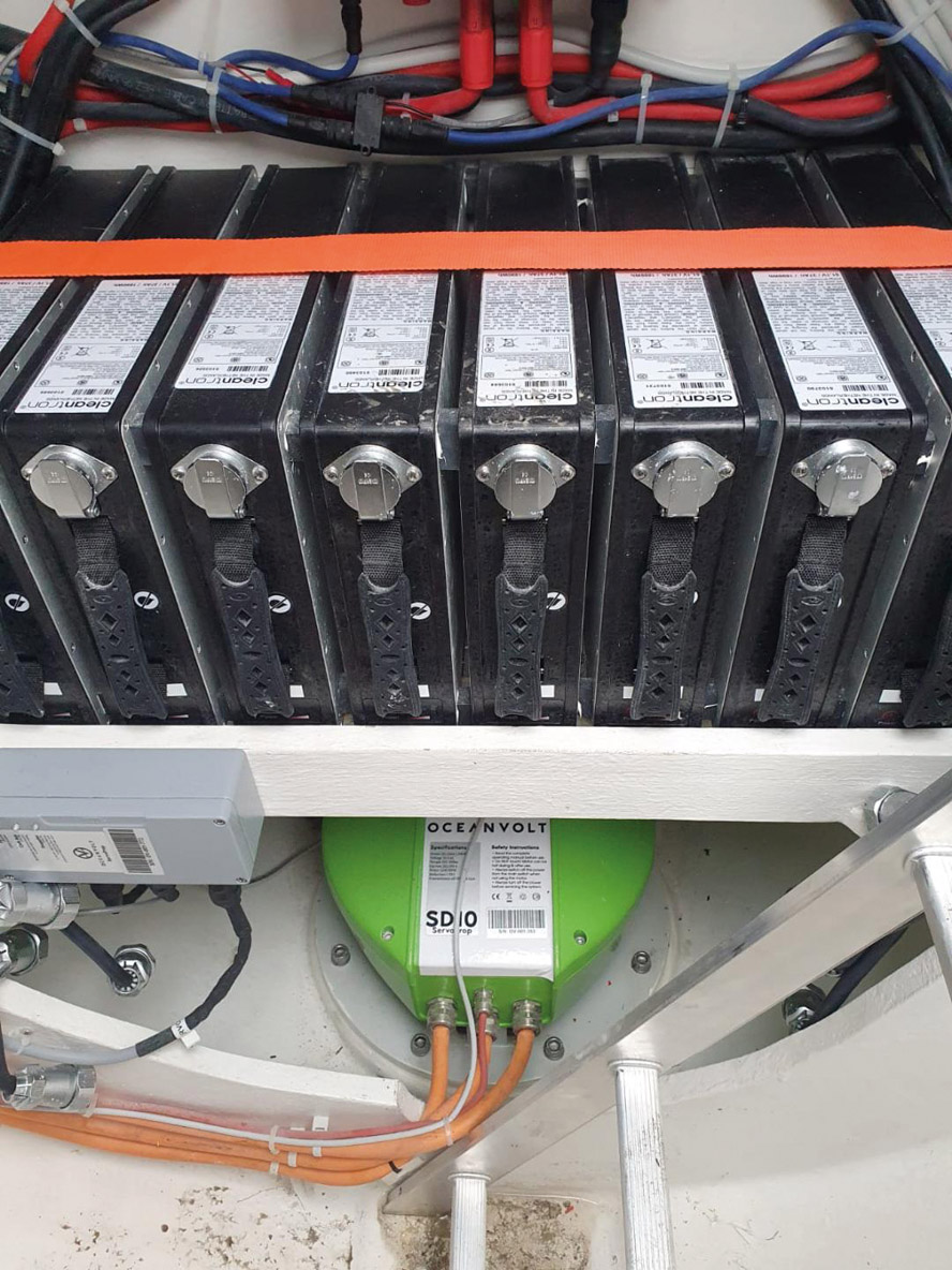 Le O’ Yachts Class 4, soucieux du poids embarqué, a misé sur des batteries NMC (nickel, manganèse, cobalt), deux fois plus légères que les « classiques » lithium/ion à puissance égale.