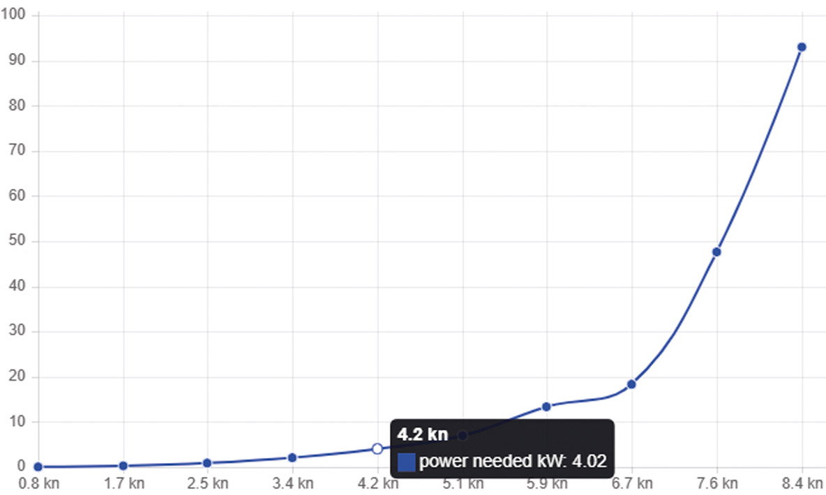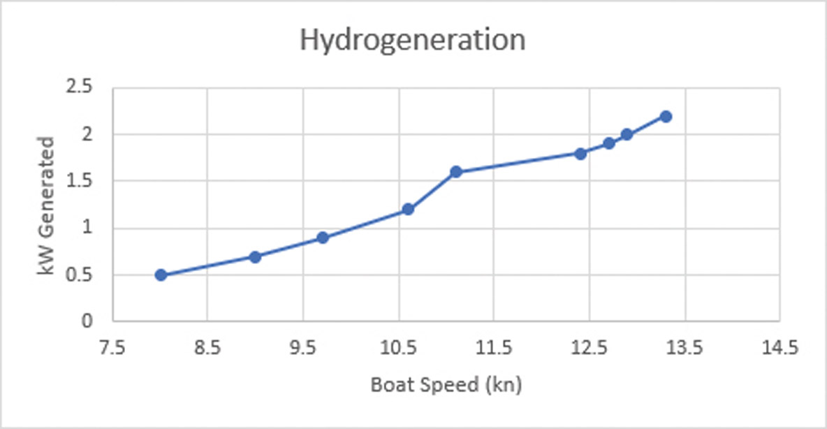 L’hydrogénération est encore assez faible à 7 noeuds de vitesse sous voile ; elle ne devient vraiment efficiente qu’au-dessus de 10 noeuds. La différence entre la courbe théorique et la réalité peut être importante en fonction de l’état de la mer.