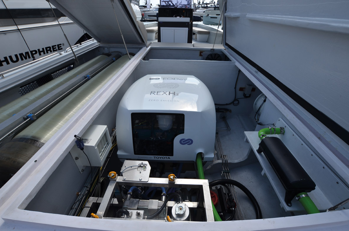 Le ratio consommation/hydrogénération d’unités performantes et au mix énergétique optimisé comme les Windelo 50 et 54 bénéficie d’un gain de rendement de 30 % à 40 % par rapport à des unités plus conventionnelles ou de plus grande série. L’évolution du stockage de l’énergie avec des nouvelles technologies de batteries deux fois plus légères – comme les nouvelles NMC que l’on retrouve sur le Class 4 de O’ Yachts – permet d’envisager une plus grande réserve d’énergie. Mais, malgré ces avancées significatives, le recours à un producteur d’énergie complémentaire respectant l’environnement comme la pile à combustible paraît inéluctable pour pouvoir se targuer de naviguer un peu plus vert encore. Saluons les premières initiatives : la société EODev a présenté la version plaisance de sa pile à combustible REXH², développée par Toyota et installée sur le catamaran d’exploration Energy Observer en 2020. Les premiers essais menés par Hynova Yachts avec 4 bonbonnes de 110 litres d’hydrogène pressurisé à 350 bars alimentant la fameuse pile REXH² ont permis de produire 60 kWh sans bruit et en rejetant seulement de l’eau. Le bateau d’essai ainsi équipé assure une autonomie de 500 milles à huit noeuds, et sa capacité d’hydrogène ne pèse qu’une trentaine de kilos. Qui dit mieux ? Avec un encombrement d’un mètre cube et un poids de 400 kg, la pile à combustible REXH² est pour l’heure la plus compacte sur ce marché. Elle pourrait convenir à nos multicoques qui ne manquent pas de place pour l’installer et stocker l’hydrogène. Le premier grand constructeur à se pencher sur le dossier hydrogène est Fountaine Pajot, qui annonce le lancement d’un premier Samana 59 équipé de cette motorisation hybride hydrogène-électrique en 2023.