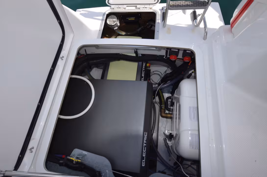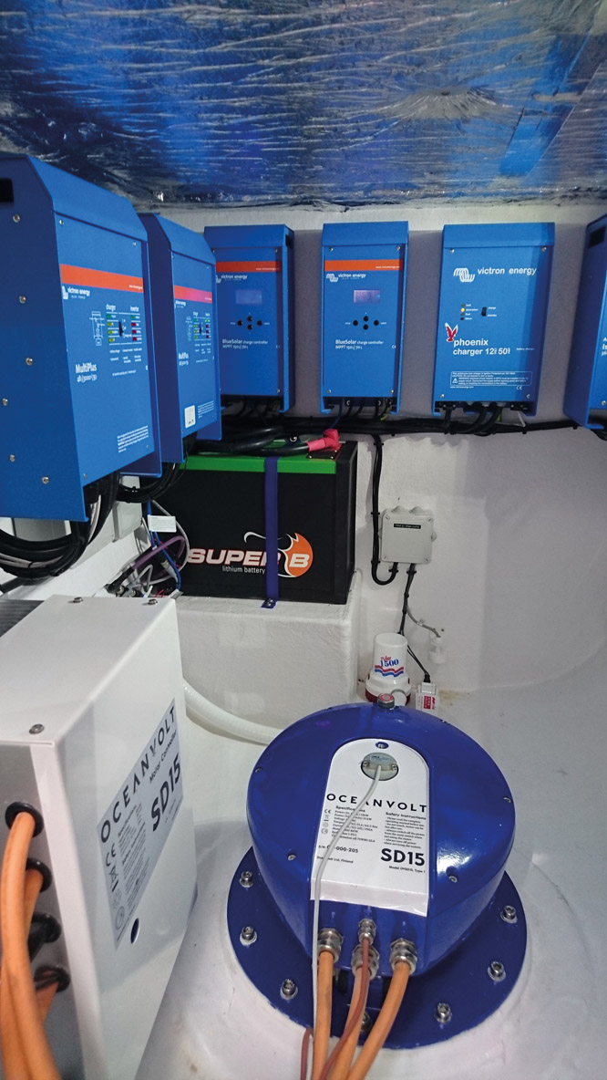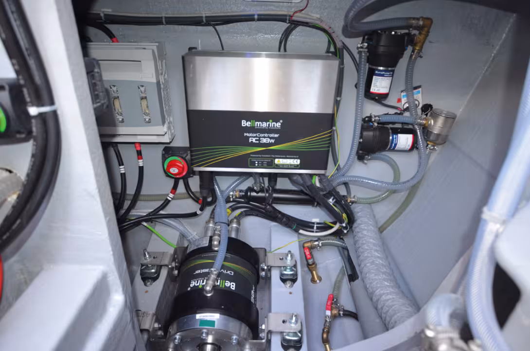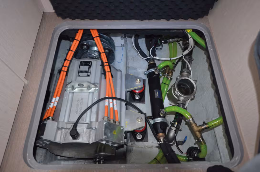 L’espace occupé par les moteurs électriques est minime, et laisse beaucoup de place pour organiser la cale moteur – ici, celle d’un Slyder 47 équipé de SD15 Oceanvolt.