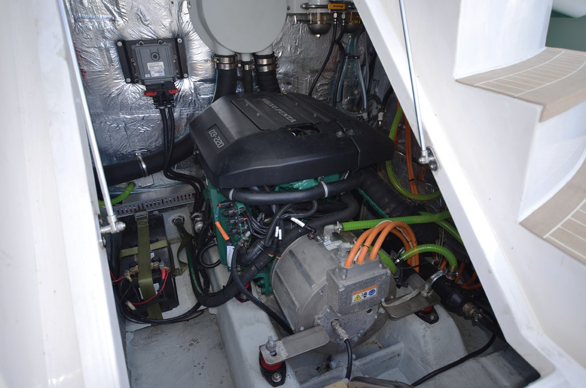 Non, il n’y a pas d’arbre d’hélice au bout de ce volant moteur de Volvo Penta D4, mais une génératrice alimentant un parc batteries XXL et des moteurs électriques.
