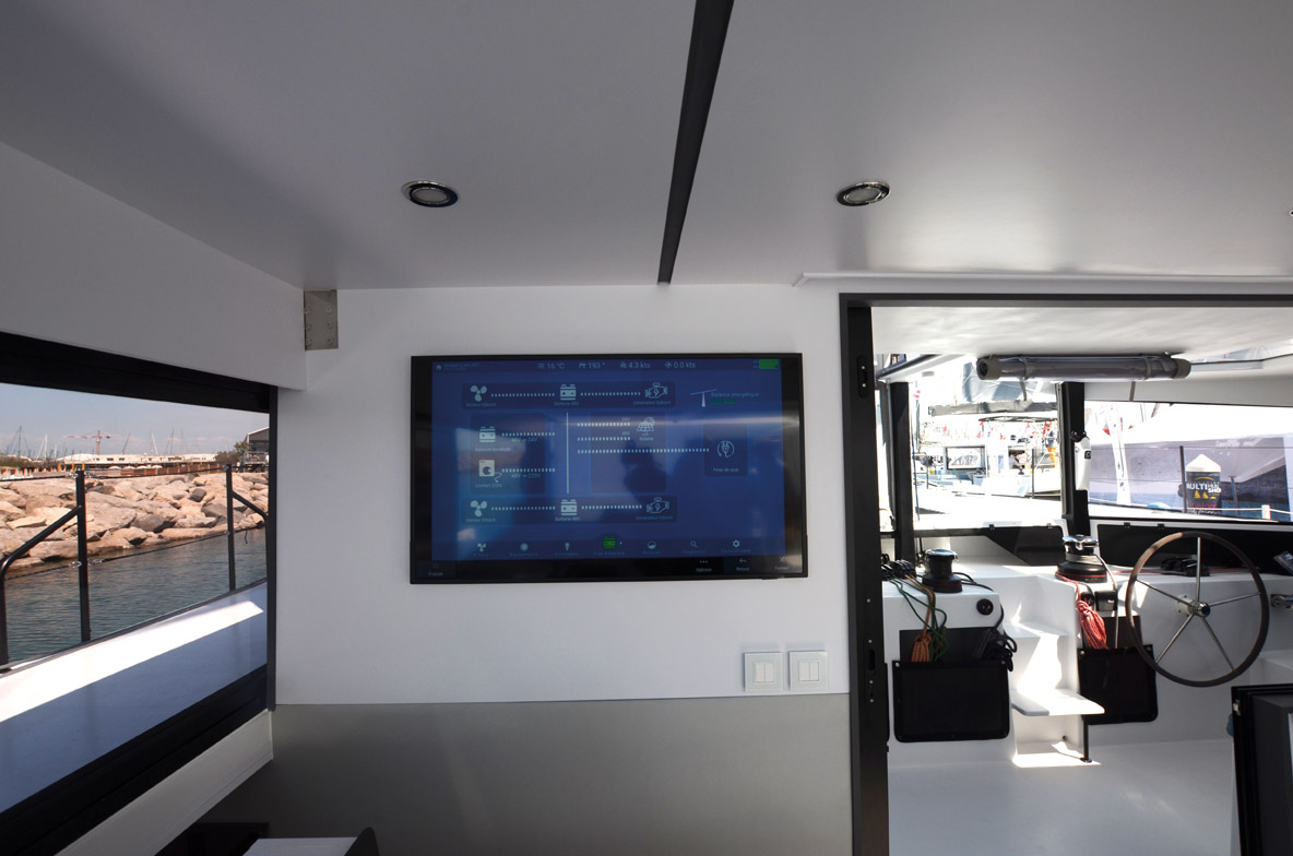 Lors des essais de l’Outremer 4.Zero, la consommation à bord – en mode frugal ! – a été drastiquement contrôlée. En faisant très attention, à cinq personnes, chaque repas consomme entre 1 et 2 kW, une douche idem, le dessalinisateur encore 2 kW, sans compter les multiples autres petits consommateurs (leds, écrans, feux de navigation, etc.). Même si l’équipe d’Outremer est parvenue à ne dépenser qu’un peu plus de 2 kWh lors d’une journée monacale, une consommation journalière de 10 kWh n’a rien du luxe. L’addition peut encore vite monter en sollicitant les winches ou le guindeau électriques, ou encore faisant tourner le lave-vaisselle. Il y a quatre ans, nous évoquions une consommation quotidienne d’environ 5 kWh pour un cata de 45 pieds ; aujourd’hui, cette consommation est parfois multipliée par quatre ou cinq. C’est le constat que fait l’Excess Lab, qui a équipé un Excess 15 d’un système Deep Blue hybride avec deux moteurs de 50 kW montés en sail drive, deux batteries lithium de 50 kWh et deux groupes de 20 kW. L’équipage d’essai a bouclé un tour de Méditerranée sans appréhension quant à la dépense d’énergie, puisque 100 kWh d’énergie sont disponibles et rechargeables en deux heures et demie avec les groupes. La moyenne journalière de la consommation, en faisant un peu attention (coupure régulière du ballon d’eau chaude, par exemple), s’est établie à 18 kWh. Pour Hervé Piveteau, responsable produit chez Excess, la motorisation électrique est une excellente pourvoyeuse de confort de par la capacité batterie, mais à condition que l’hydrogénération fonctionne à plein régime, ce qui n’est pas évident. Sur les deux semaines de navigation de l’Excess 15, le système de gestion de l’énergie relève 1 100 kWh nécessaires pour la propulsion et 255 kWh pour le service, soit 1 355 kWh de dépense. Les génératrices diesel ont rechargé 1 155 kWh, soit 85 % ; la prise de quai 160 kWh, soit 12 % et l’hydro n’a généré que 40 kWh, soit 3 % sur la période. On voit bien qu’entre les rendements théoriques et la situation réelle, de grandes marges sont à prendre en considération. Des essais ont été réalisés à la suite pour optimiser le travail de l’hélice, « le but étant à terme d’arriver à contrebalancer la consommation de servitude journalière », nous précise Jeremy Benichou, responsable des grands comptes de Torqeedo. Reste la consommation des moteurs : à 8 noeuds, les 40 kWh nécessaires sont tout juste rechargés en instantané par les deux groupes. Et s’ils marchent, c’est qu’il n’y pas de régénération possible. La gestion de l’énergie devient donc un paramètre crucial. Pour y voir plus clair, chaque fabricant possède son système de gestion de l’énergie intégré. La société Koriolan a quant à elle mis au point un système appelé ShipHeart permettant de contrôler et de piloter la consommation de chaque appareil du bord en temps réel.