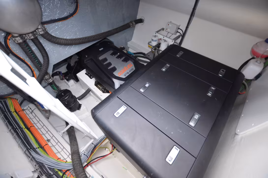 Les nouvelles batteries lithium/ ion, bien plus performantes et légères que les batteries au plomb ont permis d’offrir une réserve d’énergie tampon qui permet de couper un temps le générateur, voire de s’en passer. Mais voilà, cette énergie disponible n’équivaut pour l’heure qu’à 1 à 2 litres d’essence pour les petites batteries démontables et 10 à 40 litres de gazole pour les plus gros parcs intégrés dans les multicoques de croisière.