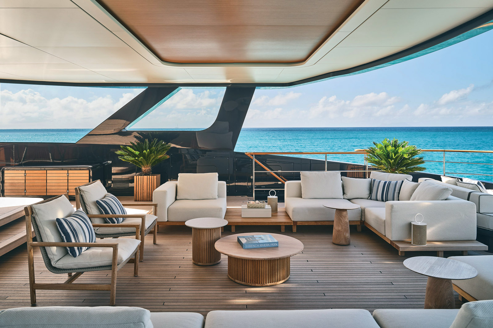 Les espaces extérieurs sont répartis sur trois zones distinctes : le cockpit, le pont avant et le flybridge. Le cockpit est aménagé de manière conviviale, avec une grande table, un espace détente et même une piscine.