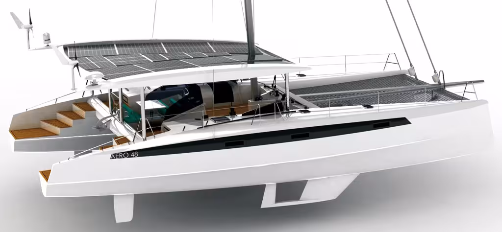 Les deux premiers Aero 48e ne vont pas tarder à être mis à l'eau. Le premier est un vrai bateau de voyage, capable d'emmener son propriétaire autour du monde, mais sans consommer aucune énergie fossile. Lorsqu'il naviguera sous ses seules voiles d'avant (il n'est pas équipé de GV), le cata de 48 pieds rechargera ses batteries grâce à ses moteurs, qui feront office d'hydrogénératrices, en une quinzaine d'heures. Un bateau donc complètement autonome. Le deuxième Aero 48 est un bateau laboratoire qui doit permettre d'aller encore plus loin dans les recherches. Pas de salon prévu pour ces deux bateaux pour l'instant, mais l'équipe de Multicoques Mag compte bien faire un essai complet dès que l'un des deux bateaux sera opérationnel...