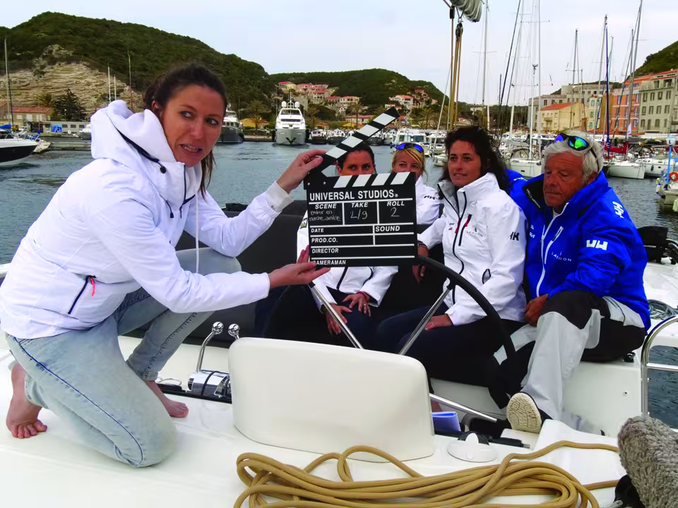 Après toutes ces émotions, les équipiers prennent leurs marques à bord. Ils sont surpris par le volume offert : « La cabine propriétaire est plus grande que mon studio ! » s’étrangle Karine, équipière novice mais apnéiste confirmée. « Si j’avais une cuisine aussi équipée que celle-ci, j’y passerais mon temps ! » affirme Alexandra, notre locale de l’étape. Place aux manœuvres de port et au tournage. Le temps est compté. La météo est plus clémente et les briefings de l’équipage vont s’enchaîner, ponctués par des prises de quai par l’avant, cul à quai, longside et en panne moteur simulée. Sans oublier l’art de la pendille, originalité typique des ports de la Méditerranée. Nathalie manage son équipage avec brio, tandis que Christine, notre réalisatrice, alterne plans larges, plans serrés et plans drone avec son équipe pour donner corps à ce premier chapitre. Lauren, notre scripte, veille au bon déroulement du tournage et à l’enchaînement des plans. Entre termes marins, techniques et règles de sécurité à respecter, nos trois équipières tentent de tout mémoriser ; une seule solution : recommencer et recommencer encore, jusqu’à ce que les gestes deviennent automatiques. Le Kissing Pig, restaurant sur la marina, devient rapidement notre cantine.