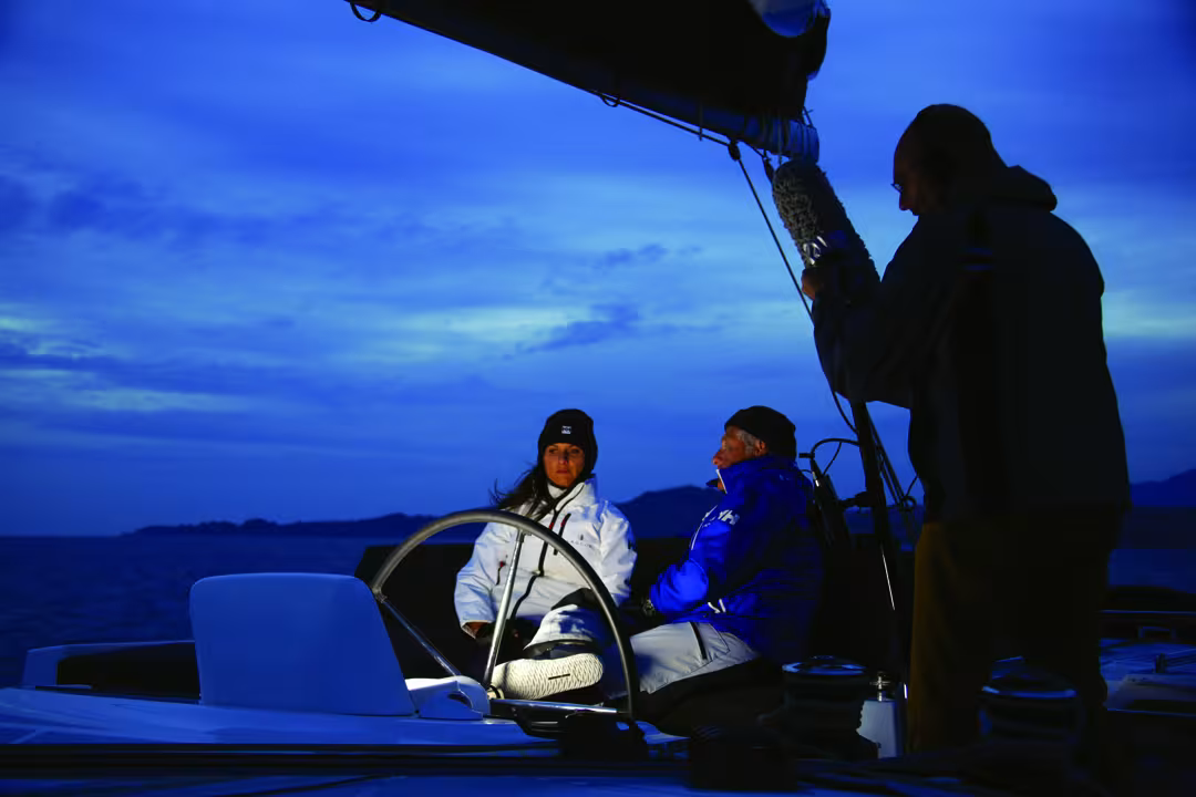 Après les manœuvres au port, nous voilà enfin en mer, en route pour les Bouches de Bonifacio. Le programme ? Toujours des manœuvres, mais sous voile. Le temps est favorable pour la navigation… et pour le vol du drône ! Virement de bord, empannage, envoi du Code 0 et prises de ris sur une mer belle. La visibilité parfaite : Sardaigne à l’horizon et îles Lavezzi à portée d’étraves. Chacun profite de ces instants rares, sans oublier ce pour quoi il est à bord : tourner un documentaire et découvrir la navigation . Et quoi de mieux qu’un multicoque pour apprendre sereinement et sans gîte ? Mais déjà le jour décline à l’est alors que la lune se lève. Il est temps de se préparer à une navigation de nuit.