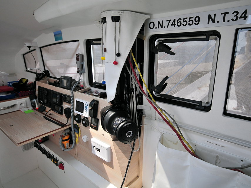10 : Le poste de barre maître est à tribord, la station accueille l’écran de contrôle et de commande de toutes les fonctions hydrauliques ainsi qu’un Panic Button (un constrictor) pour la voile d’avant, et bien sûr les commandes électriques moteurs.