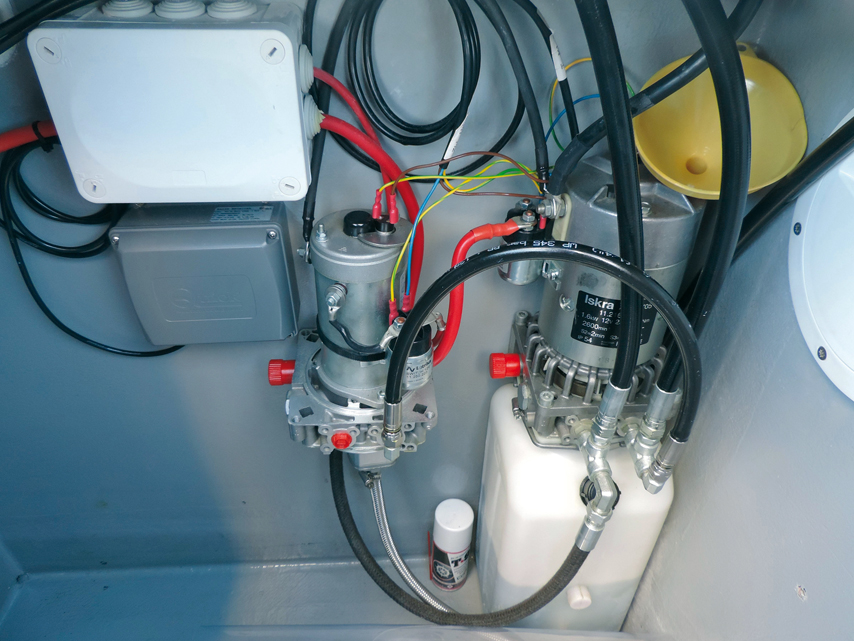 7 : La centrale hydraulique et ses deux moteurs électriques (petites et grosses charges) sont logés dans un coffre de la poutre avant à moins d’un mètre du parc batteries, l’ensemble ne pèse que 25 kg !